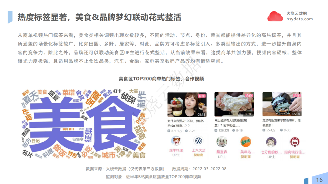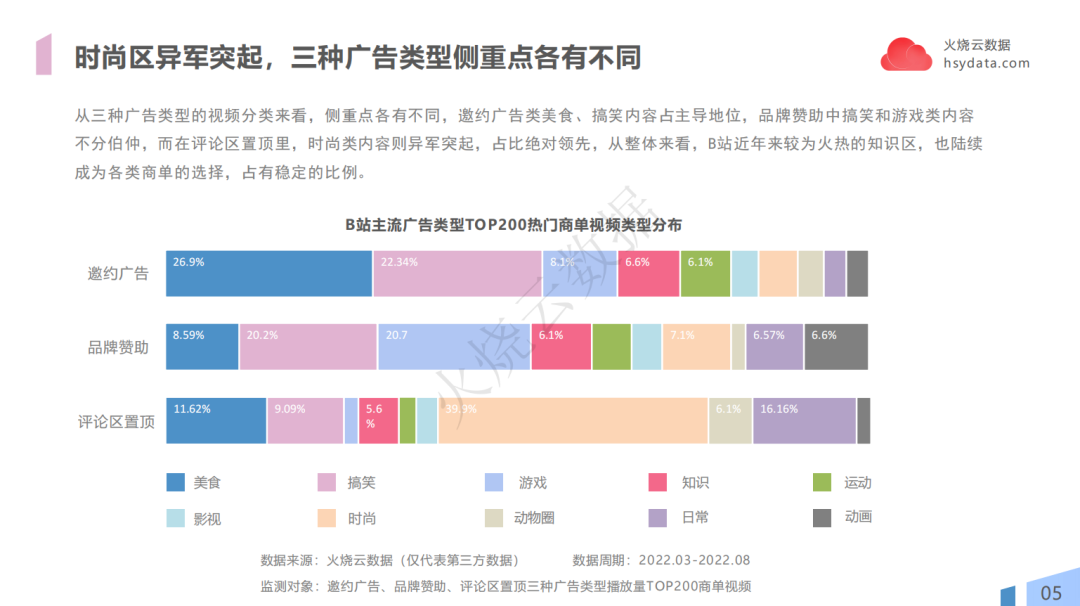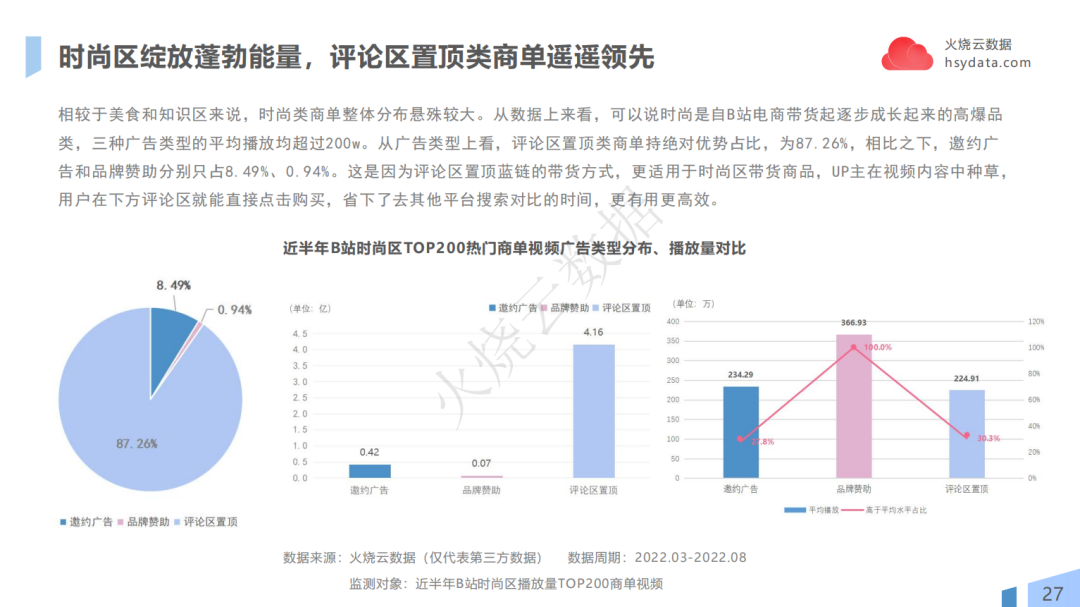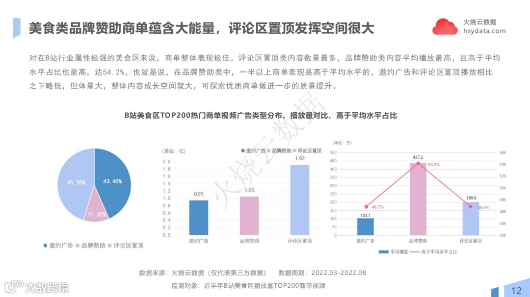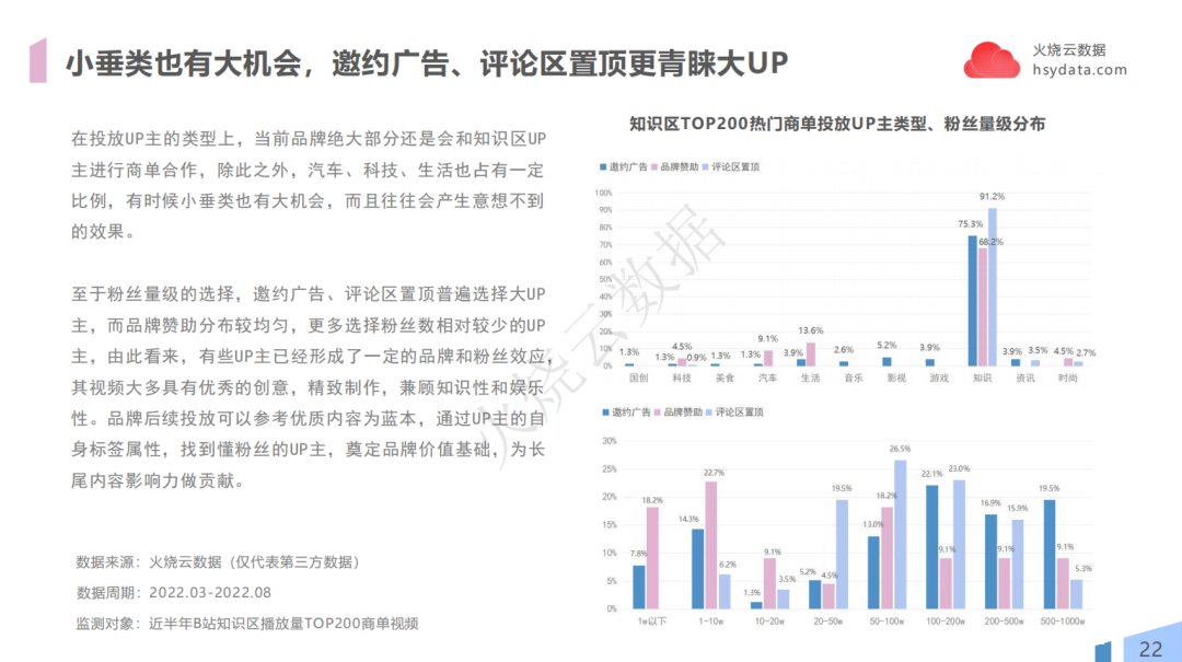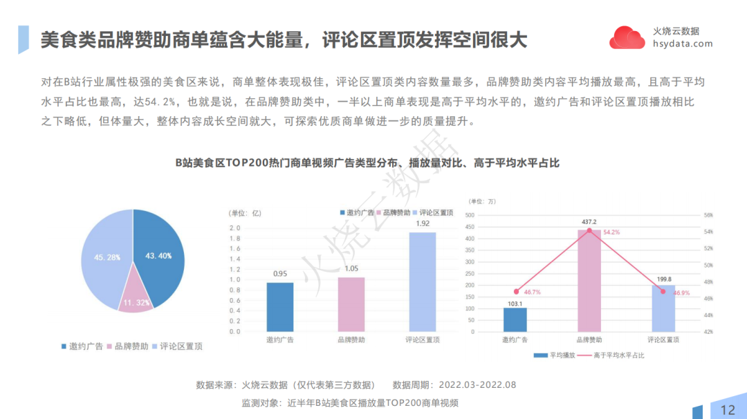 当前B站的主流广告类型有:邀约广告、品牌赞助、评论区置顶蓝链,品牌方可借此实现活动引流、私域账号加粉、产品转化等多类目标;此外,从行业角度来看,B站不止是游戏、动漫爱好者的聚集地,更是为美食、知识、时尚等多圈层人群提供内容养分,更多垂直行业机会明显。