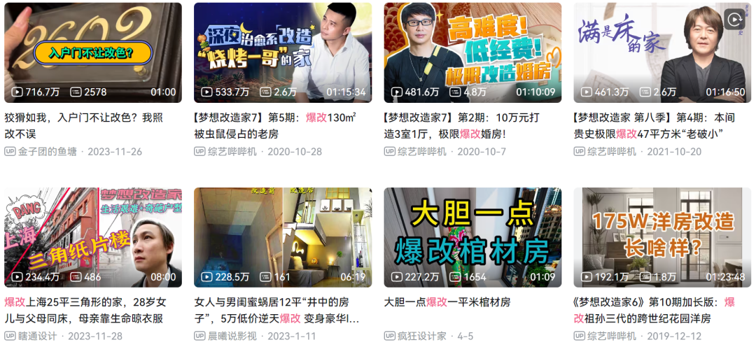 「爆改」本身就是近两年比较火的关键词,B站较火的视频内容多为老房爆改、奇葩户型爆改等,往往居住环境差、改造目标高,加上爆改前后的巨大反差,提供了很强的吸睛能力,常常一条视频就能获得大量流量。