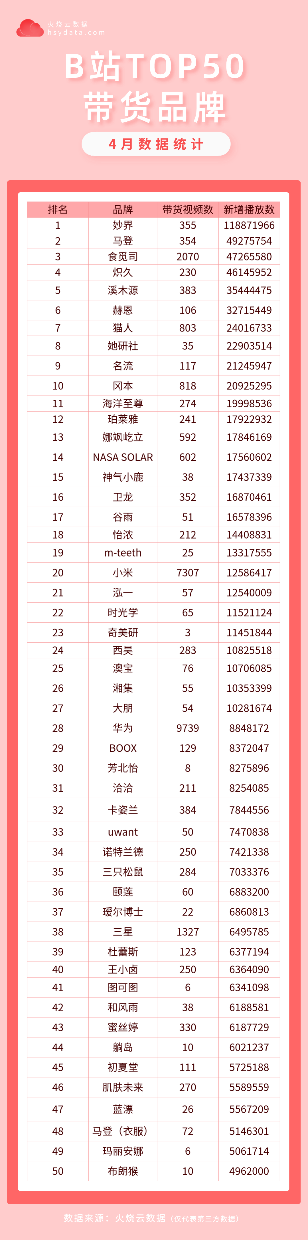 * 榜单按照B站带货视频的月度新增播放量从高到低排名。