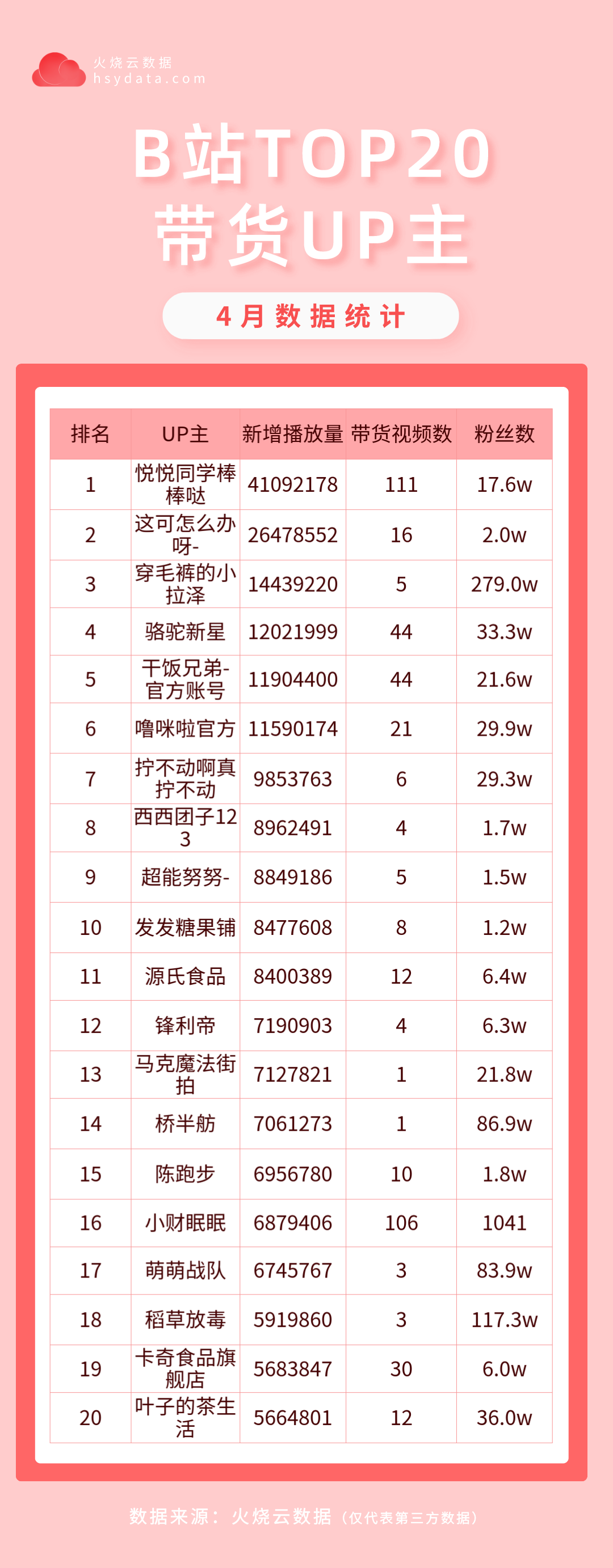 * 新增播放数:该UP主4月份所有蓝链带货稿件的总播放,即4月份新增播放量;仅计算内容与带货商品关联性较强的视频。