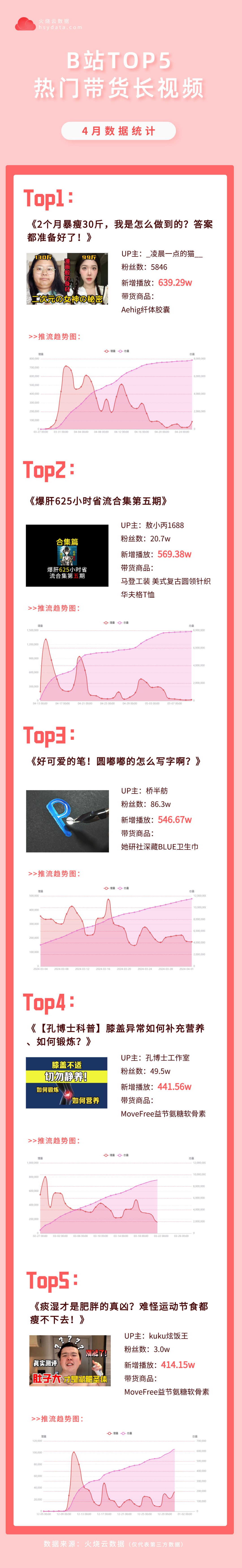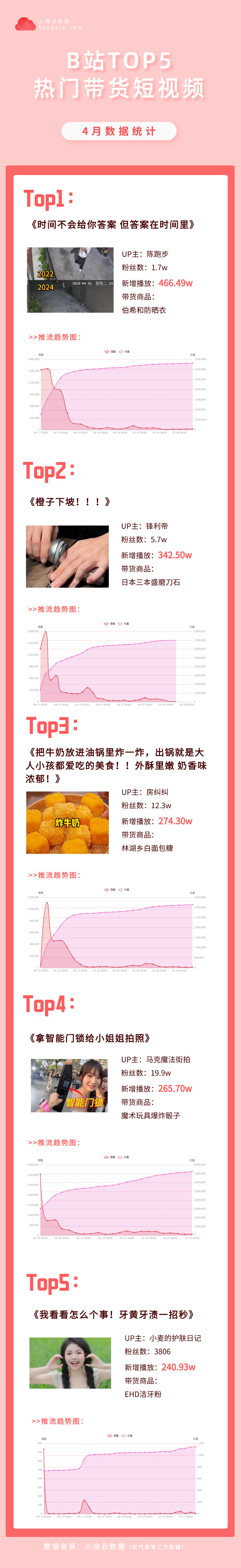 4月,UP主@悦悦同学棒棒哒 位列榜首,属于发布种草视频为主的素材号,带货以玩具、日用为主。