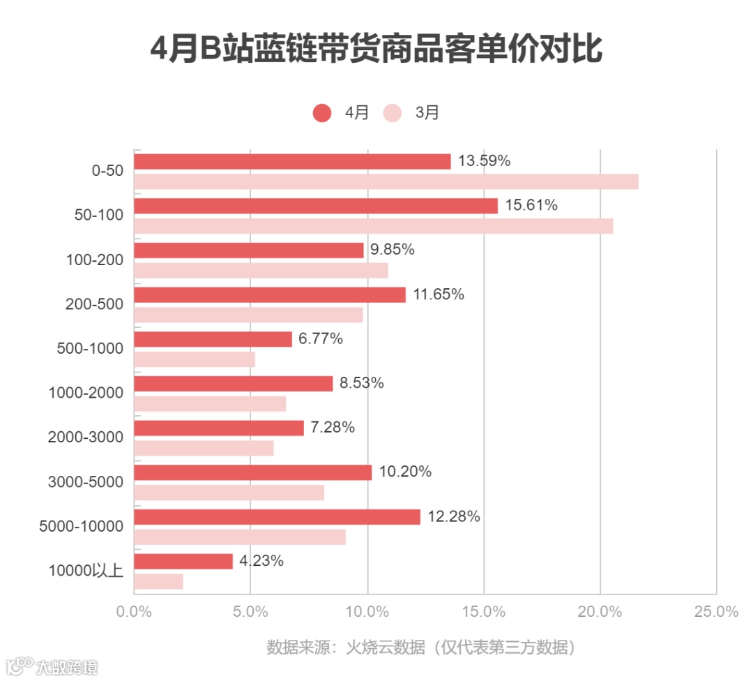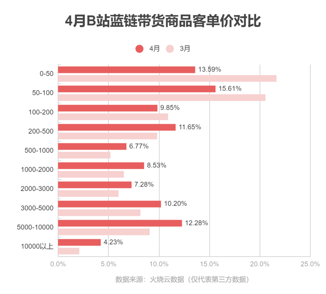 蓝链商品客单价仍以100元以内为主,但总体呈下降趋势;其次占比最多的是5000-10000区间和200-500元区间。4月整体客单价上涨较多。