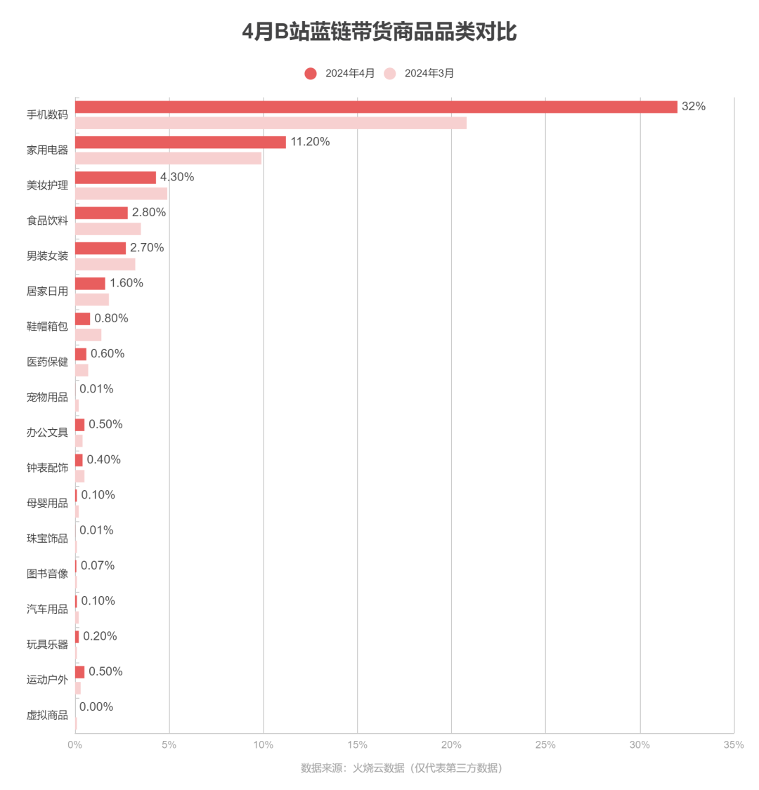 4月份蓝链带货的品类主要是「手机数码」「家用电器」「美妆护理」。其中,「手机数码」持续大幅上涨,占比从20.8%,上升到32%。