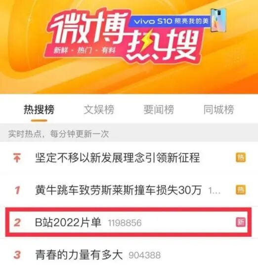 #B站2022片单#一经发布,便收获全网关注,话题在3小时内,超7600万阅读、2.7万讨论,冲上热搜第2位。