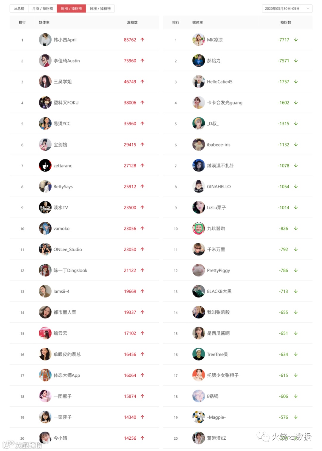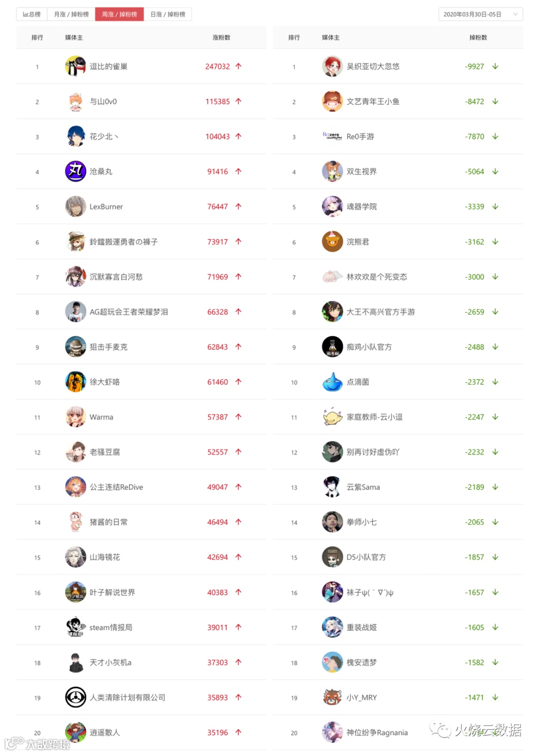 在首个粉丝破千万大事件的加持下,上一周B站的粉丝数据表现如何?火烧云数据周榜(3月30日-4月5日)为你解读。
