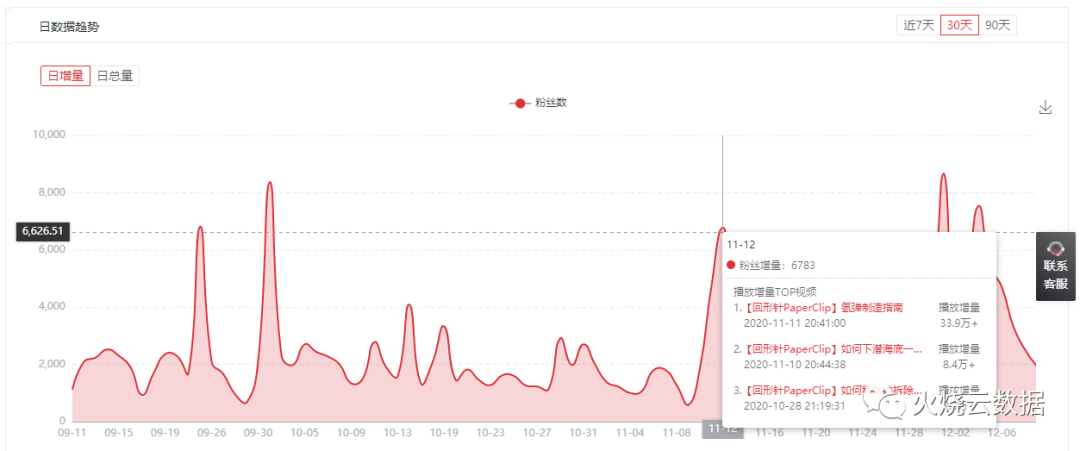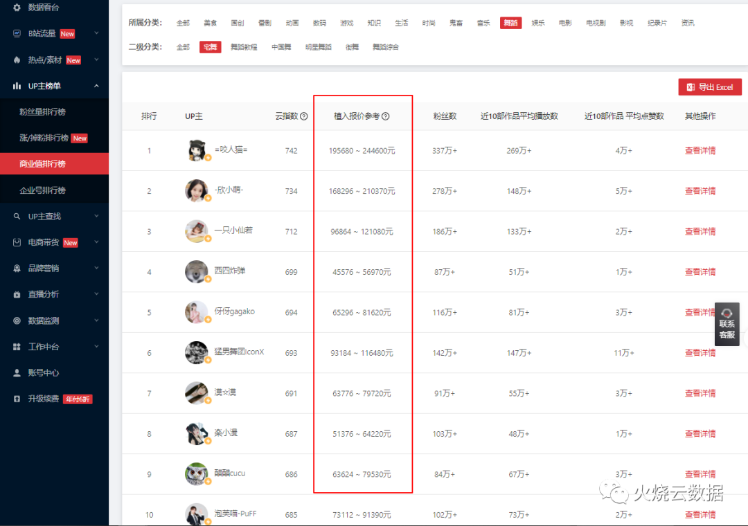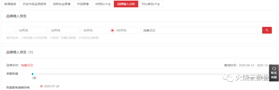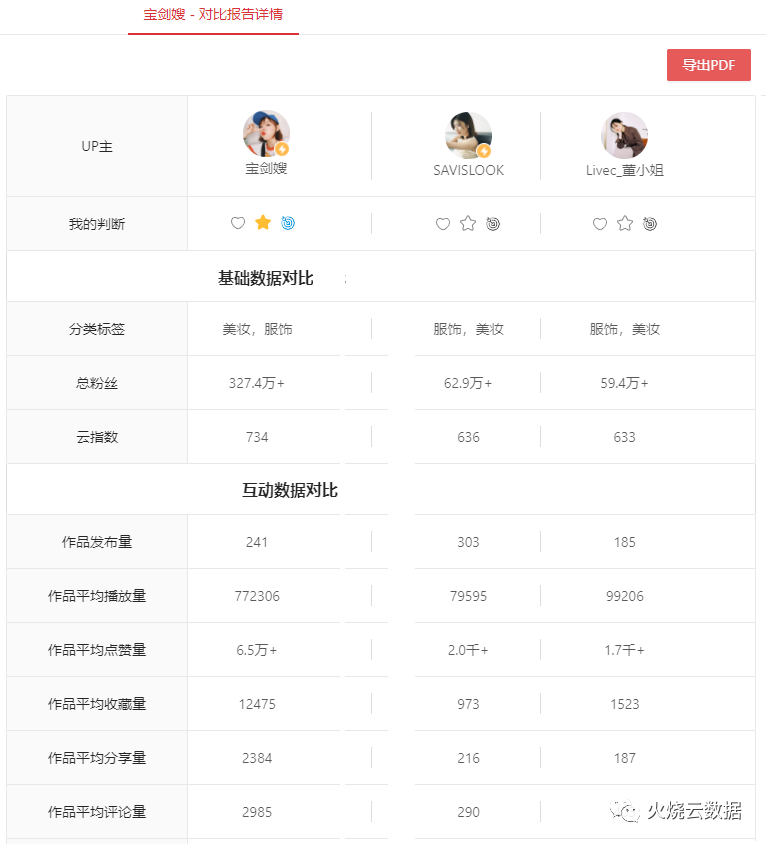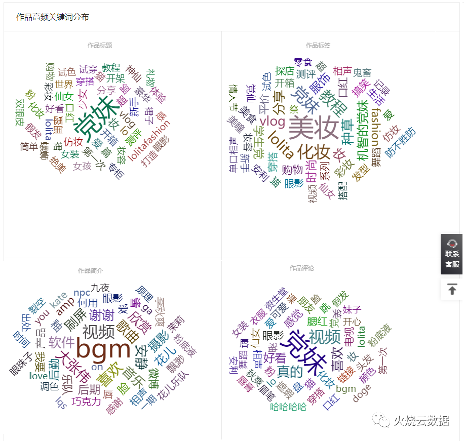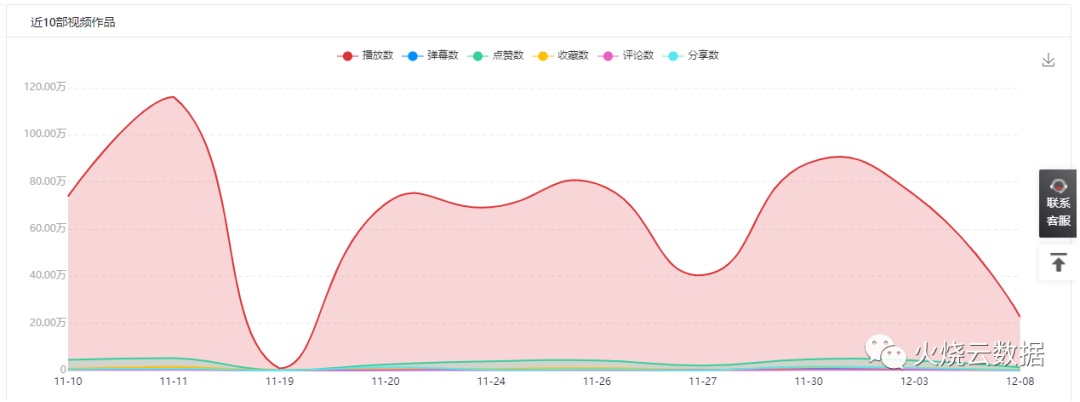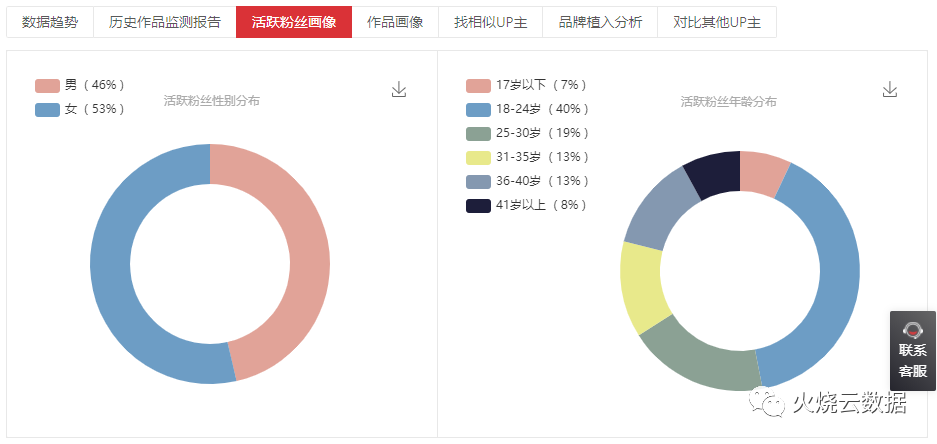 以前都是把UP主视频一条一条看过来,现在只需要通过火烧云数据-UP主详情页-作品画像,只需一眼,即可判断UP主的视频偏好、类型偏好、粉丝观看偏好等。