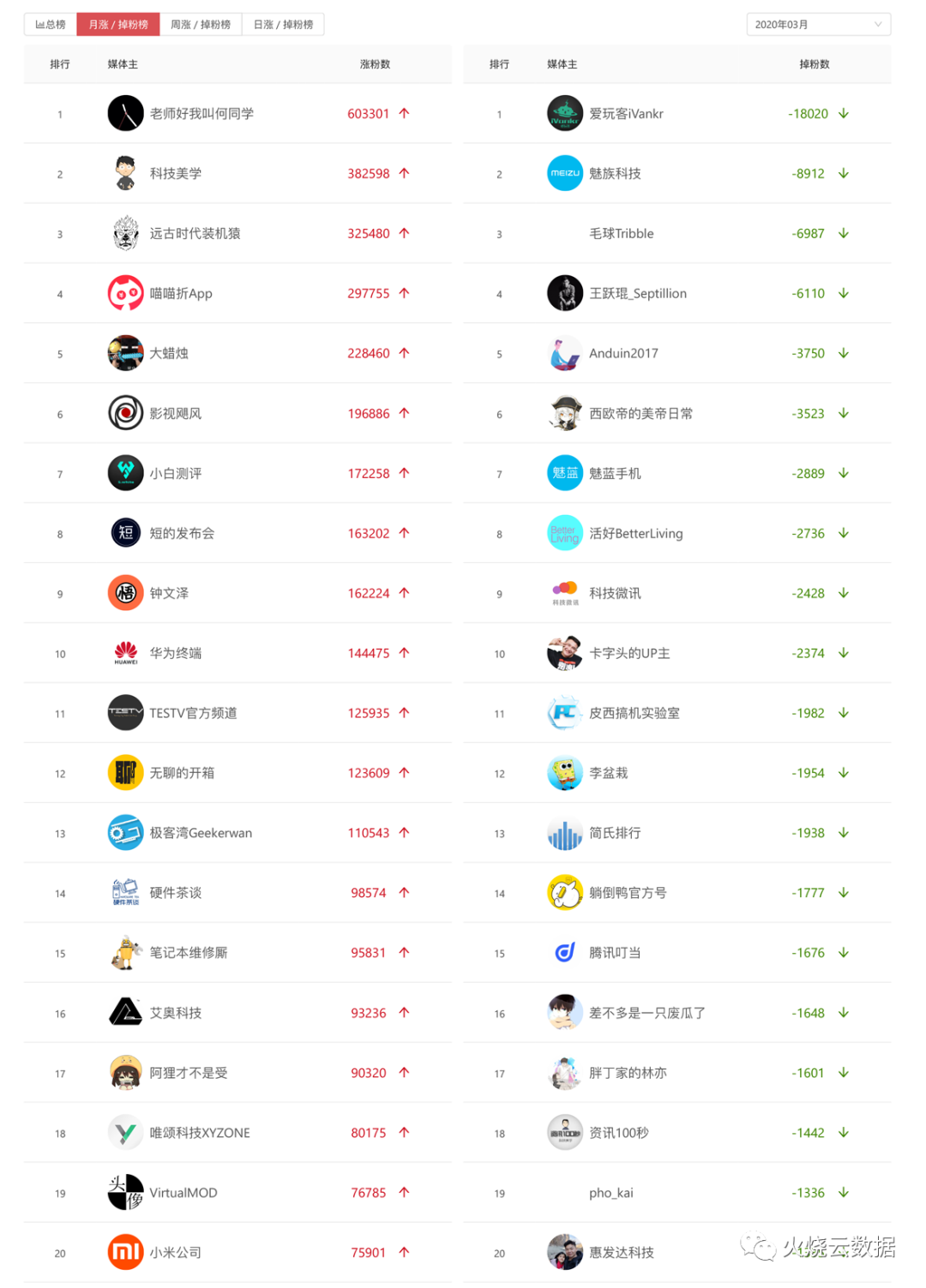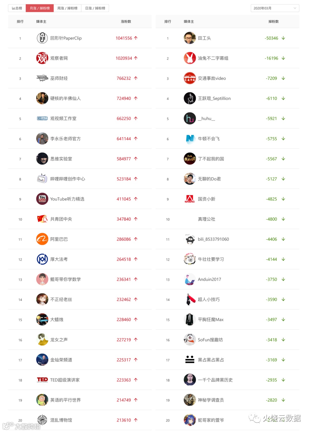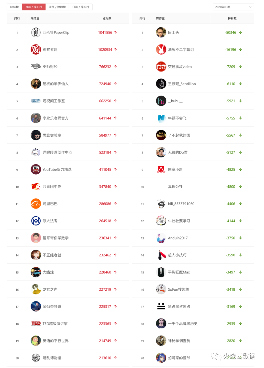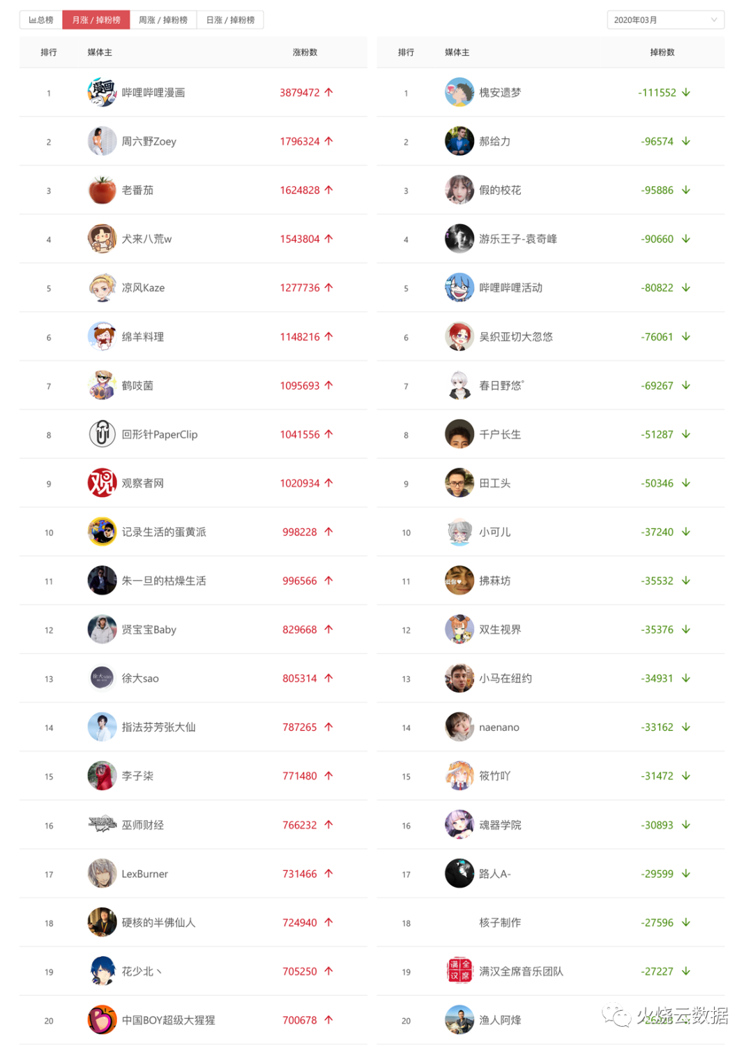 说明:1、以下榜单数据由火烧云平台追踪提供,本月火烧云数据除了发布全B站、数码、科技、生活榜单外,官网同步更新其他垂直细分领域3月榜单涨粉/掉粉排名榜。2、火烧云月榜是1个满月的数据,如UP主@罗翔说刑法是3月9号进驻B站,无法计算一整个月,故不计入榜单。