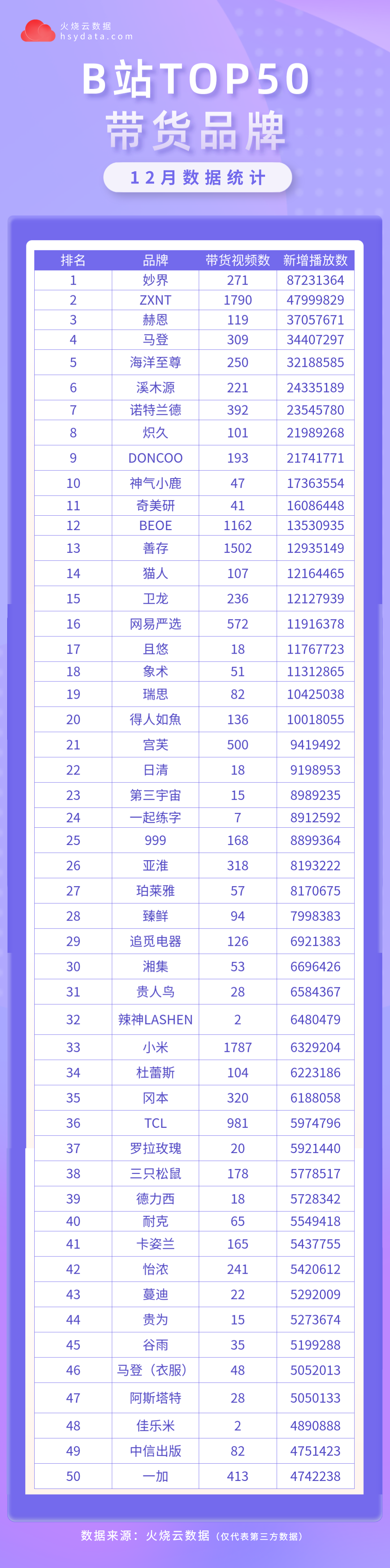 * 新增播放数:该品牌12月份所有带货视频的总播放,即12月份新增播放数。