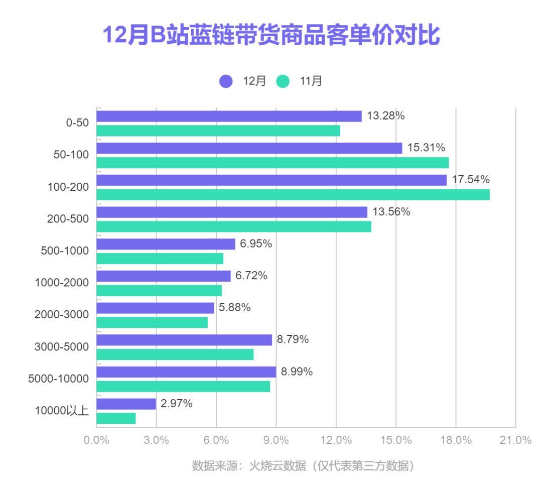 12月蓝链商品客单价仍以100-200区间为主。其中,客单价50元以下、500元以上商品的占比继续上升,客单价50-500元商品占比继续下降。