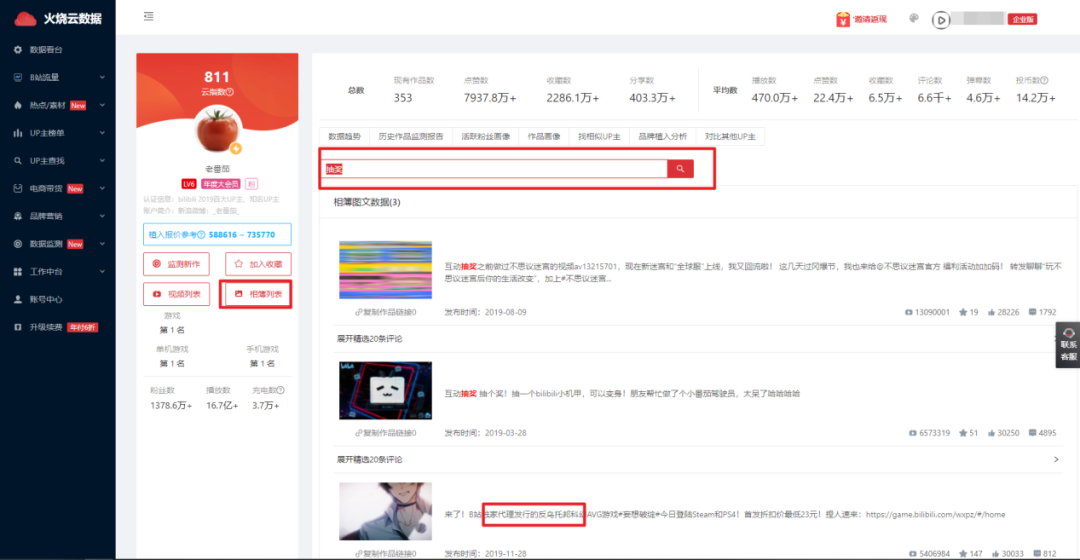 通过火烧云数据进入UP主详情页,点击【视频列表】或者【相簿列表】,再通过关键词搜索,快速找到恰饭视频作品,分析视频数据和产品植入详情以及恰饭节奏。