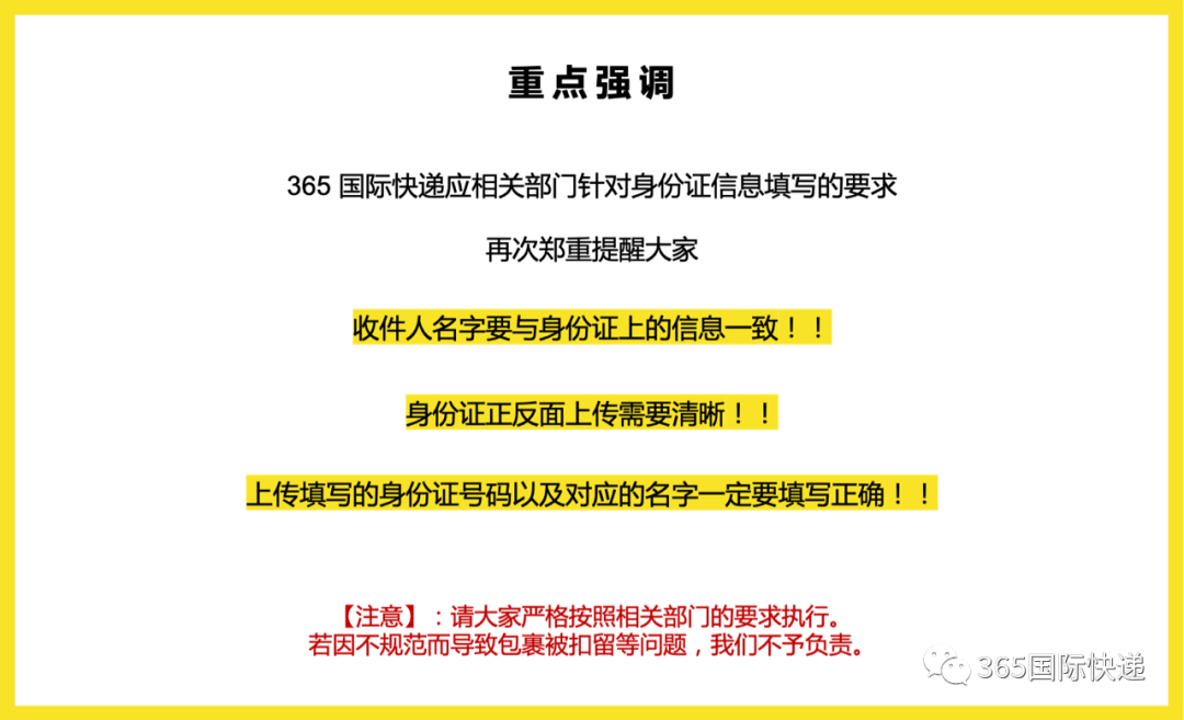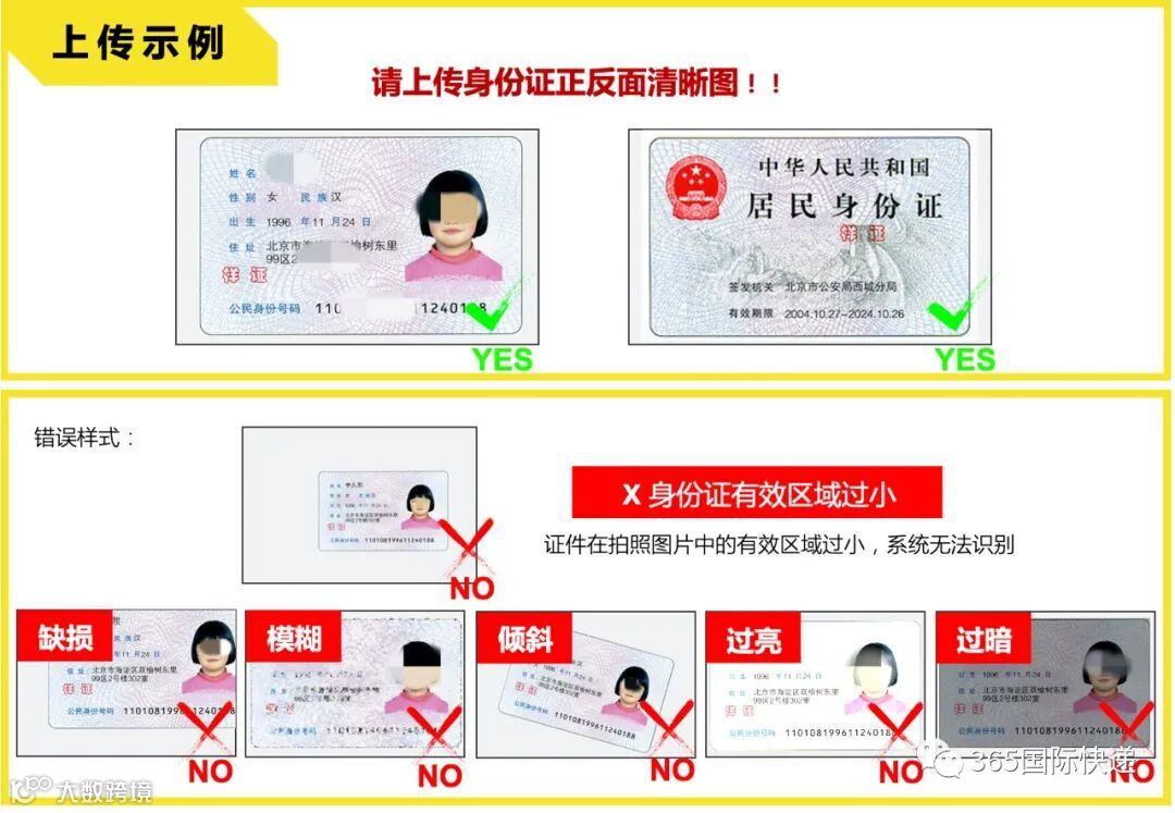 365国际快递为了给大家提供更好通关服务,请务必在包裹寄出后24小时内,上传收件人的真实身份证正反两面。
