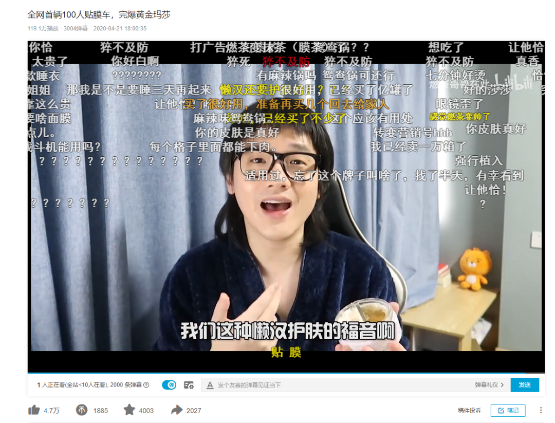 例如护肤品牌Fresh跨越既有圈层,联合游戏区UP主“燃茶哥哥在此”跨界合作,为产品定制视频。UP主以“全网首次100人贴膜车”为切入点,将“车子贴膜”过渡到“人也需要贴膜”,抓住用户嫌贴面膜麻烦的痛点,推出为熬夜党量身定制且只需涂抹的Fresh睡眠面膜,植入自然不生硬。该则视频播放量破百万,高于UP主作品的平均播放数。