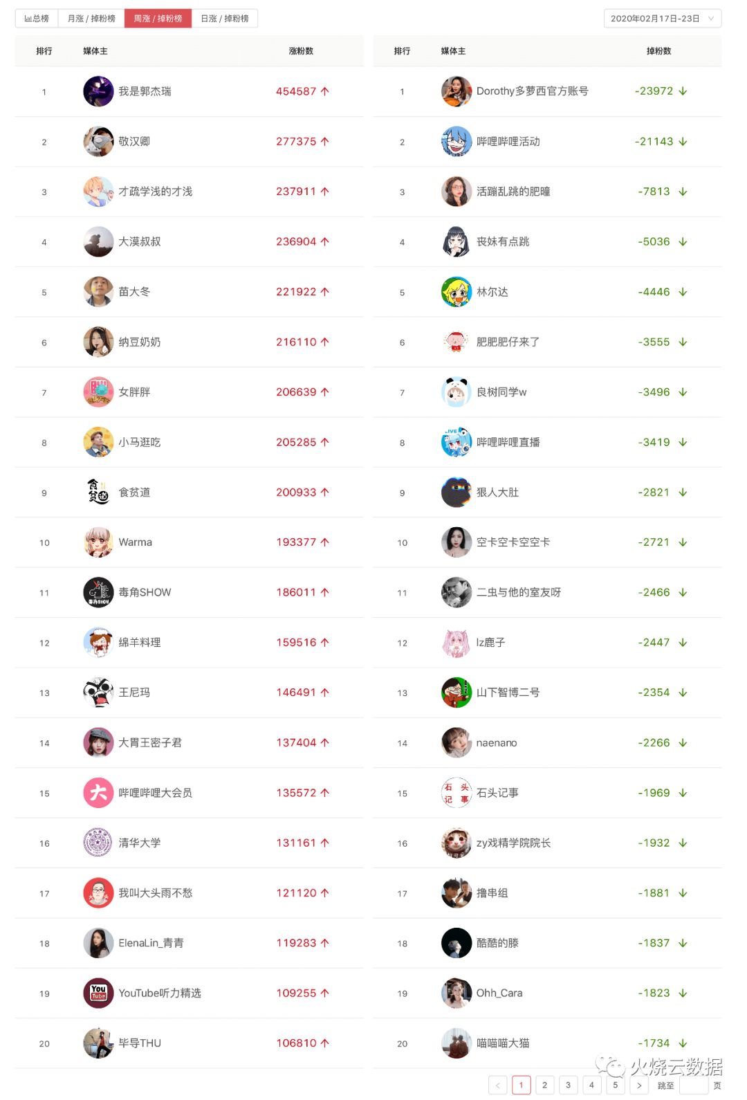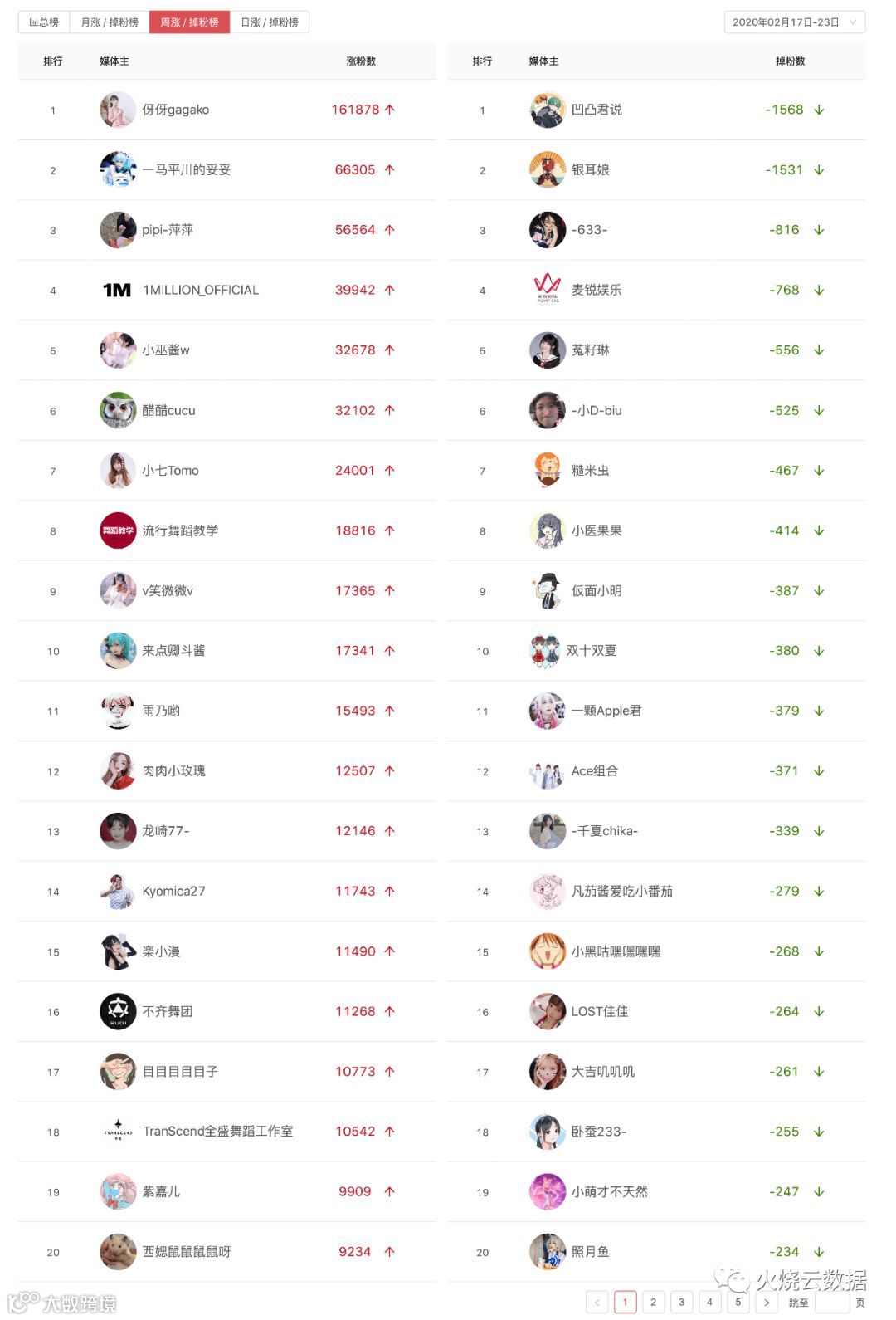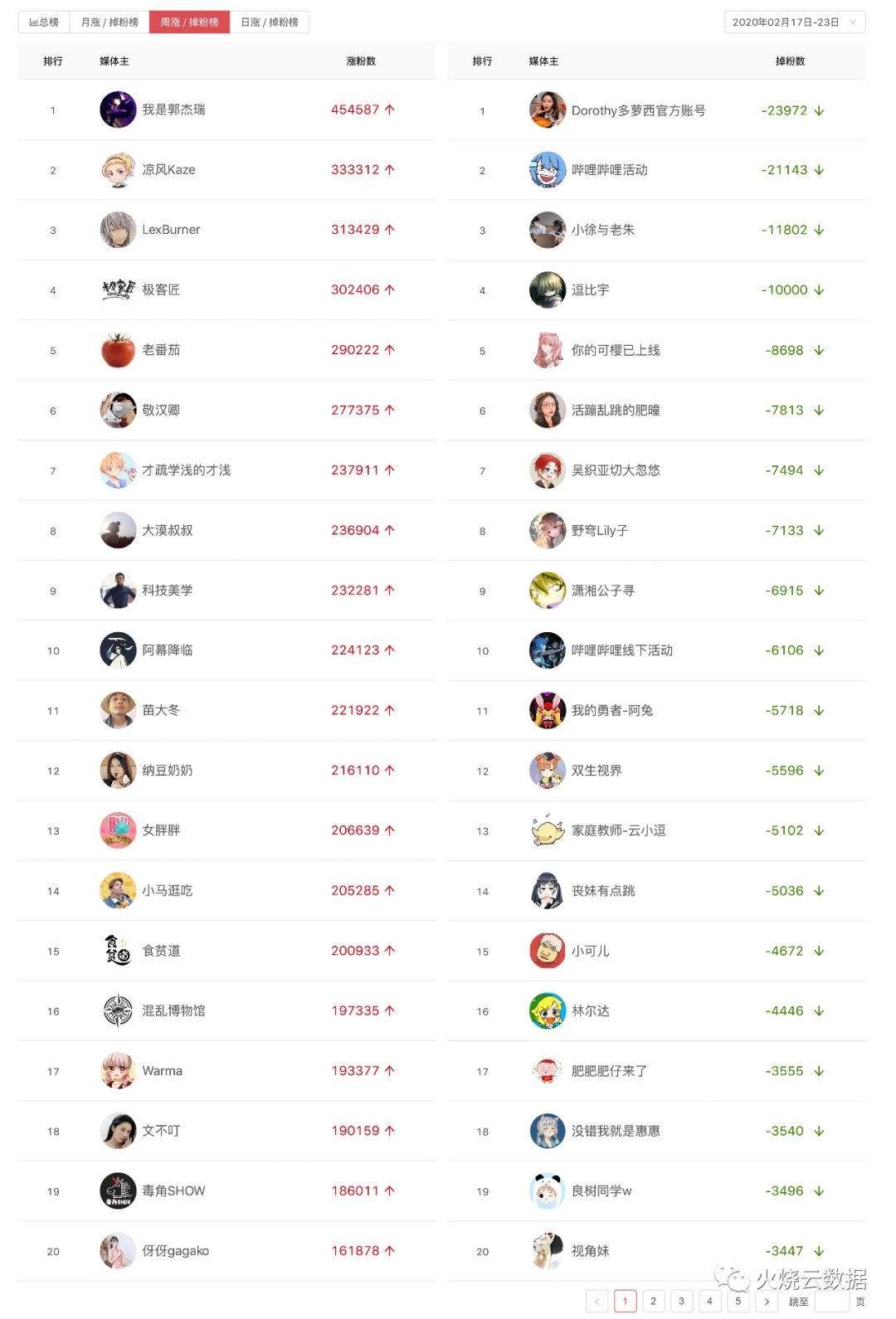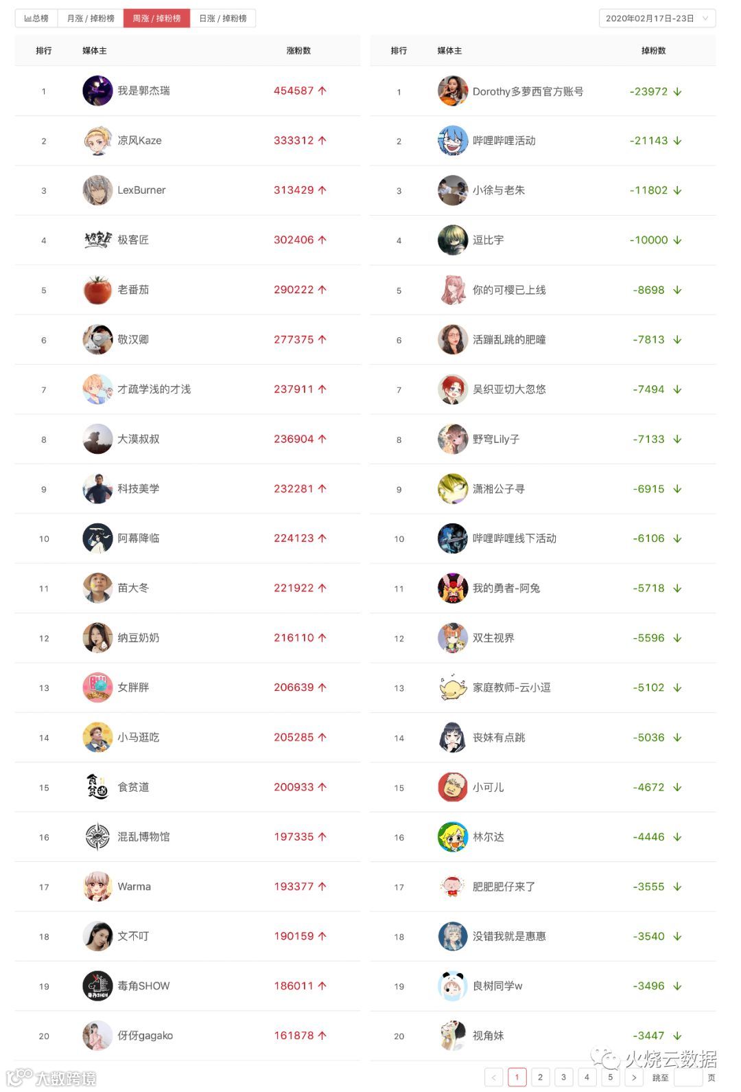 最新一周火烧云数据榜单更新,本次榜单统计了2月17日-2月23日B站涨粉/掉粉数据,按照惯例此次榜单依旧分析4个行业类目:1、全B站榜单,2、时尚类榜单,3、生活类榜单,4、舞蹈榜单,选取每个榜单涨粉/掉粉TOP20,纵横对比一周内数据变化情况。