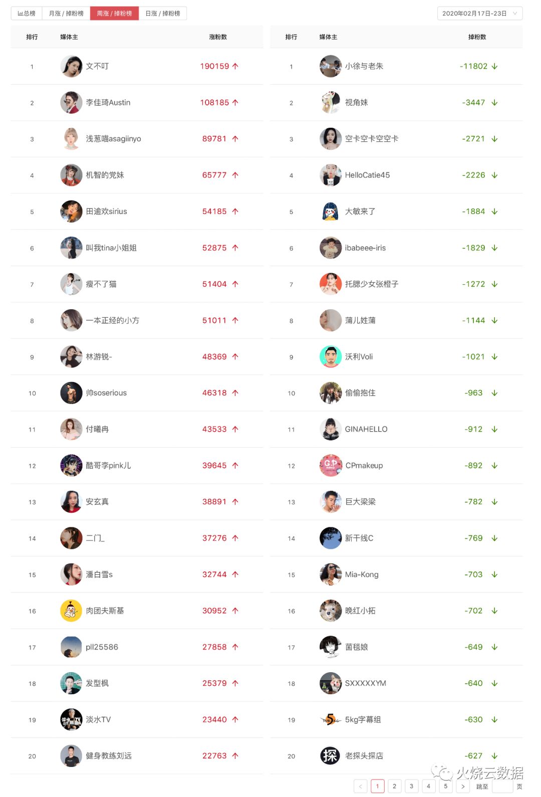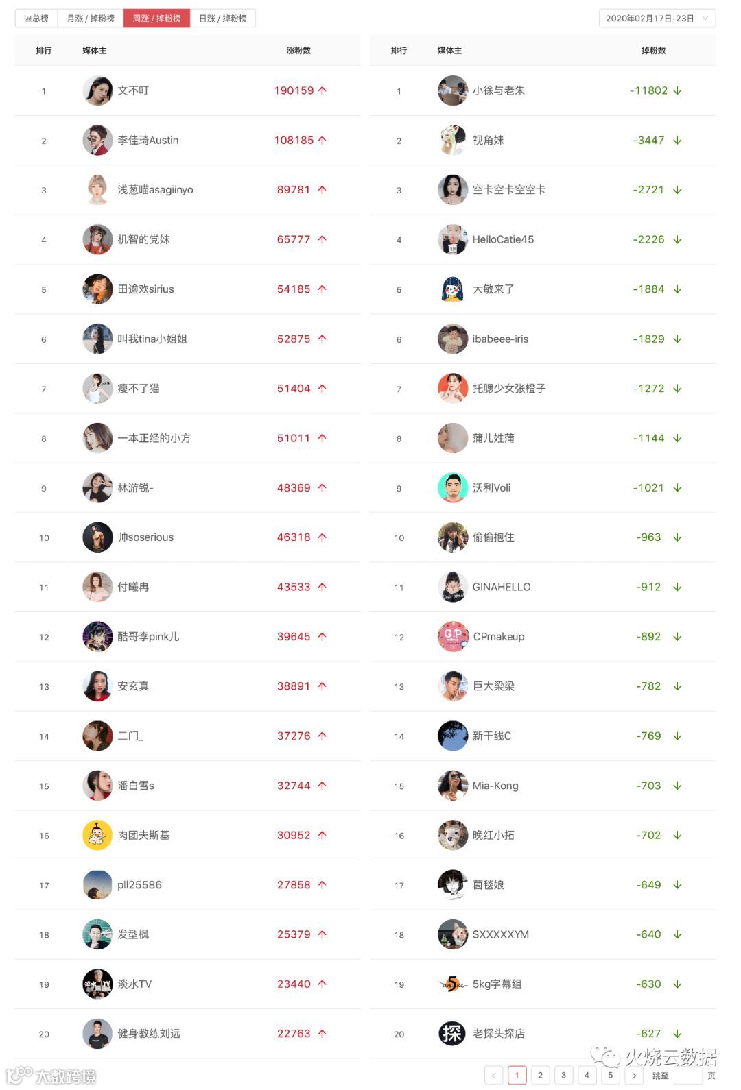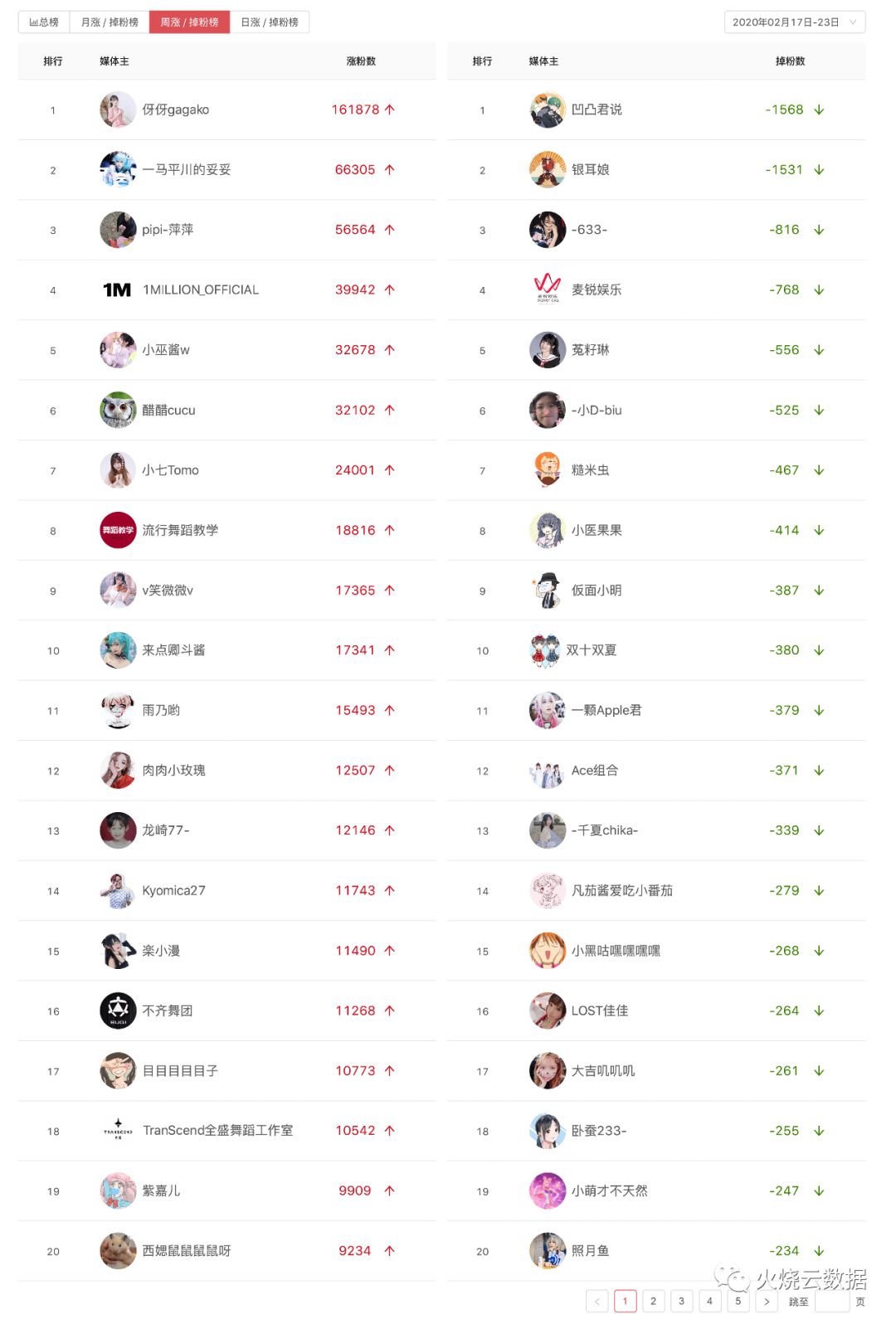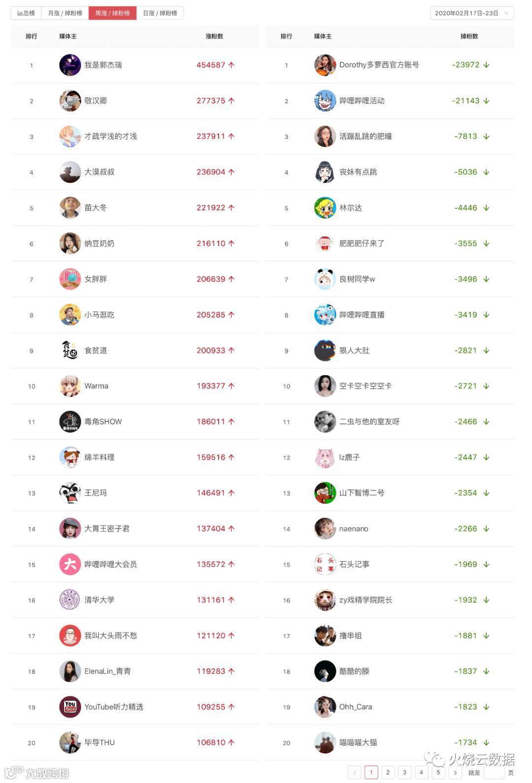 最新一周火烧云数据榜单更新,本次榜单统计了2月17日-2月23日B站涨粉/掉粉数据,按照惯例此次榜单依旧分析4个行业类目:1、全B站榜单,2、时尚类榜单,3、生活类榜单,4、舞蹈榜单,选取每个榜单涨粉/掉粉TOP20,纵横对比一周内数据变化情况。
