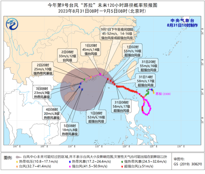 未来趋势:“苏拉”将以每小时5-10公里的速度向西北方向缓慢移动,逐渐向广东中东部一带沿海靠近。未来120小时路径概率预报图如下: