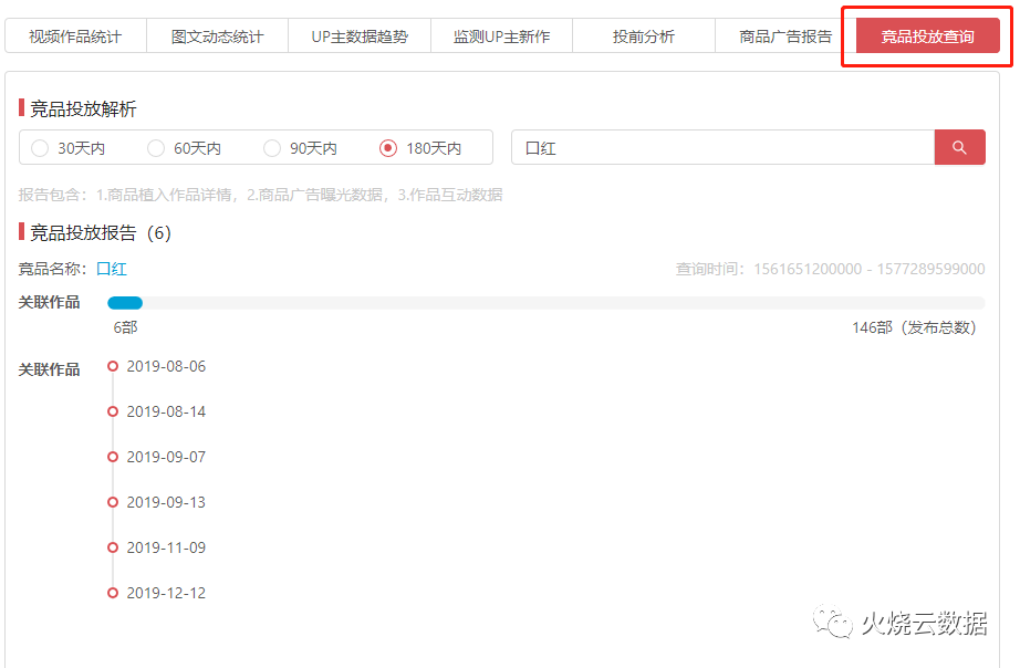 可查看30、60、90、180天内竞品的投放情况,比如搜索口红,可以看到在指定时间段内相关作品的数量和发布日期。