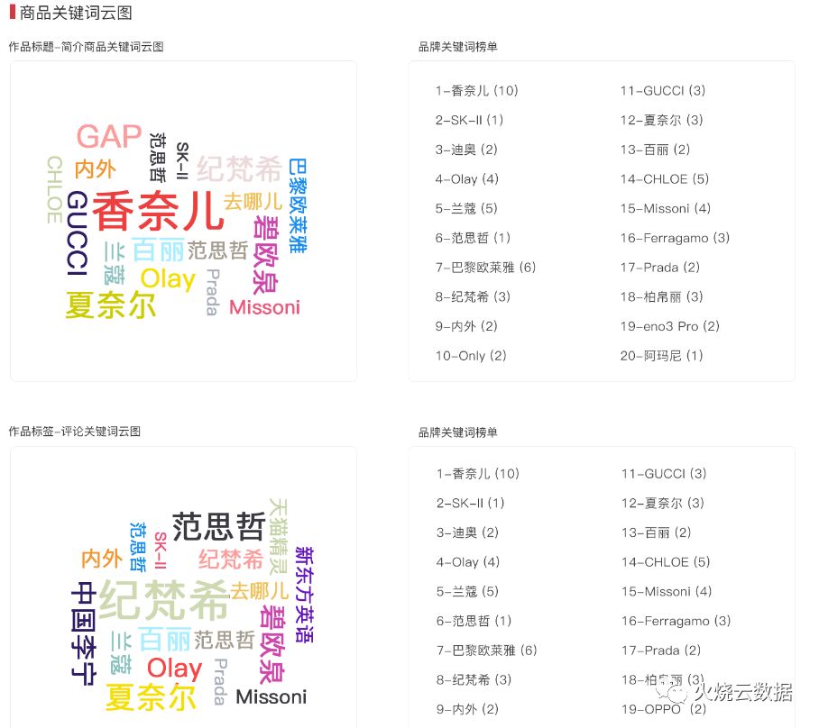 商品关键词云图展现的是在up主标题和简介中出现频次最高的品牌名称,通过图片中字体的大小和关键词榜单排行快速分辨单个品牌在广告中出现的频次,复投率越高的品牌说明他粉丝的接受度更高。