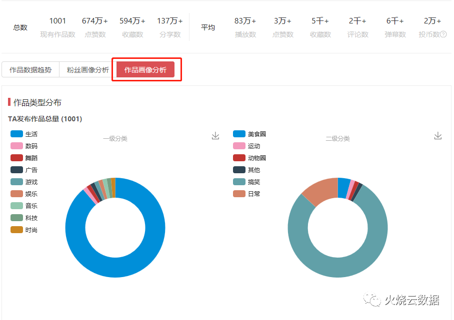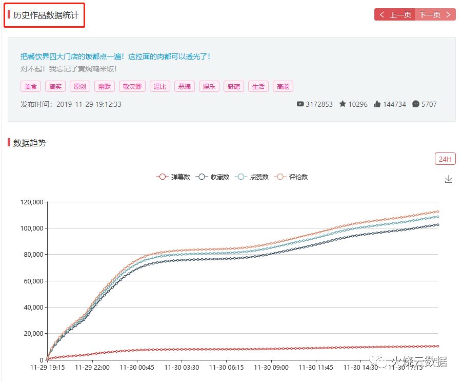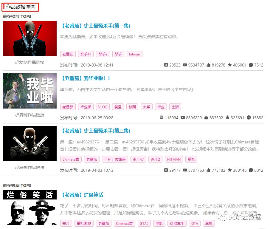 作品数据趋势统计了up主既往的作品数据,第一条展示的是up主最新的视频,标题、标签、时间、评论和播放数据一目了然。