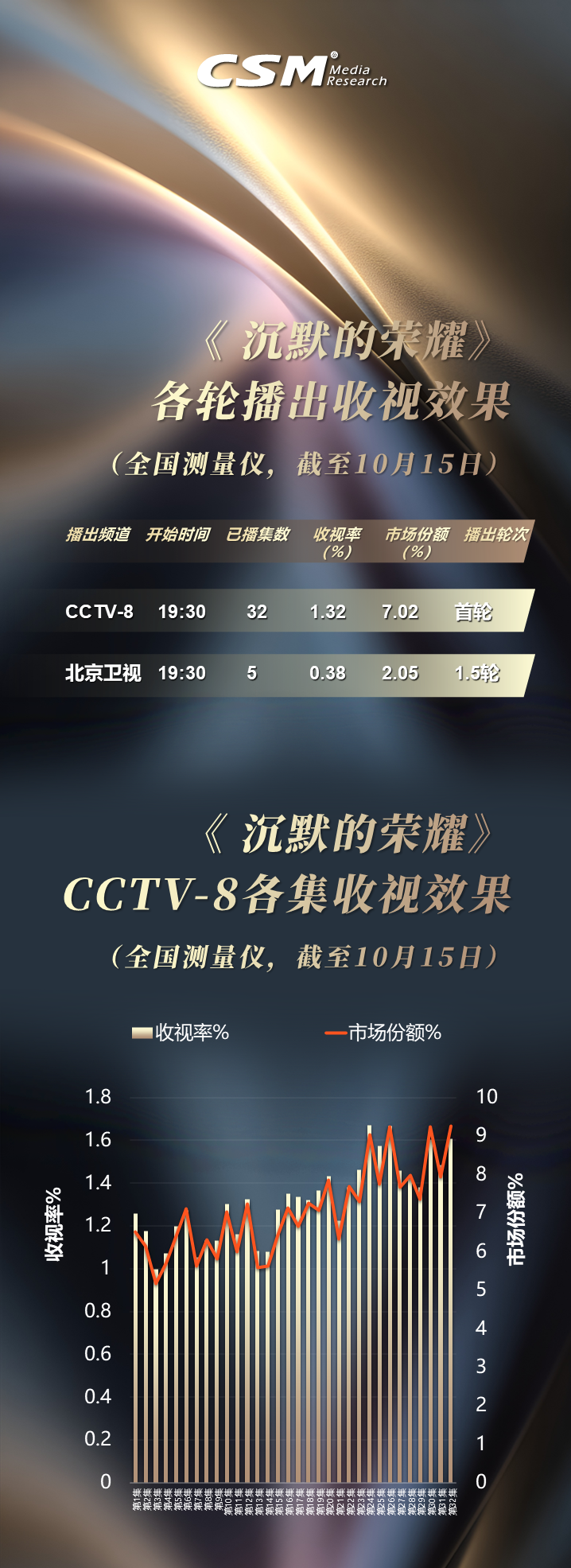 《沉默的荣耀》在CCTV-8首播时,便收获了“准点守屏”的观众热潮。截至10月15日首轮播出32集,CSM全国测量仪数据显示,该剧平均收视率1.32%(平均收视份额7.02%),稳居全国上星频道同时段第一,印证了其“叫好又叫座”的特质。这种热度还延伸到了跟播:北京卫视于10月13日开启1.5轮跟播,截至15日已播出5集,收视率达0.38%(市场份额2.05%),即便错过首播,仍有观众愿意“回头追”。