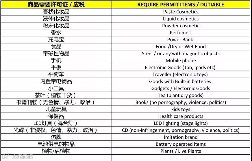 以上为马来西亚东马海关归为限制物品清单,限制的物品包含了需要许可证清关& 应税的商品以及违禁品。