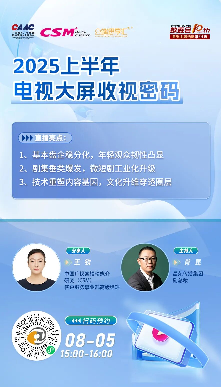 2025年8月5日15:00-16:00,中国广视索福瑞媒介研究有限责任公司(CSM)联合中国商务广告协会数字营销专业委员会共同举办主题为“2025上半年电视大屏收视密码”云端思享汇。本次活动由CSM客户服务事业部高级经理 王钦 作为分享嘉宾,由昌荣传播集团副总裁 肖昆 主持。