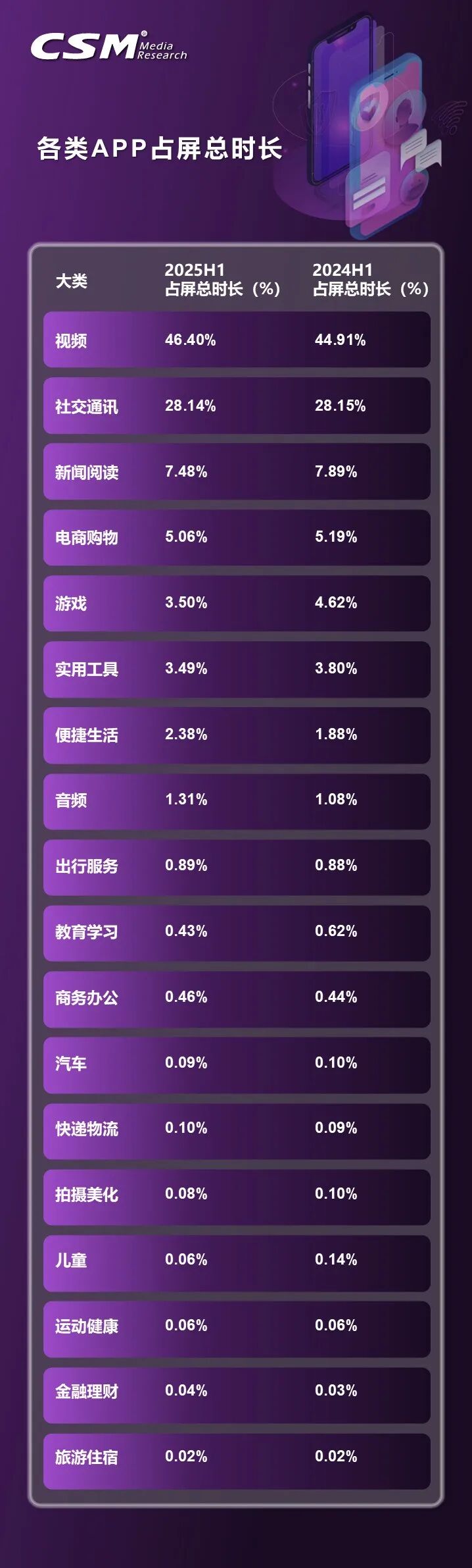 如果按占屏时长给APP们排座次,视频类绝对是“上座”里最显眼的那一位,46.40%的占比,比去年又高了一些。短视频的碎片消遣、短剧的“5分钟速食”、长剧的连贯追更、连同吃饭时搭着看的“电子配菜”,都是它稳稳占住C位的底气。