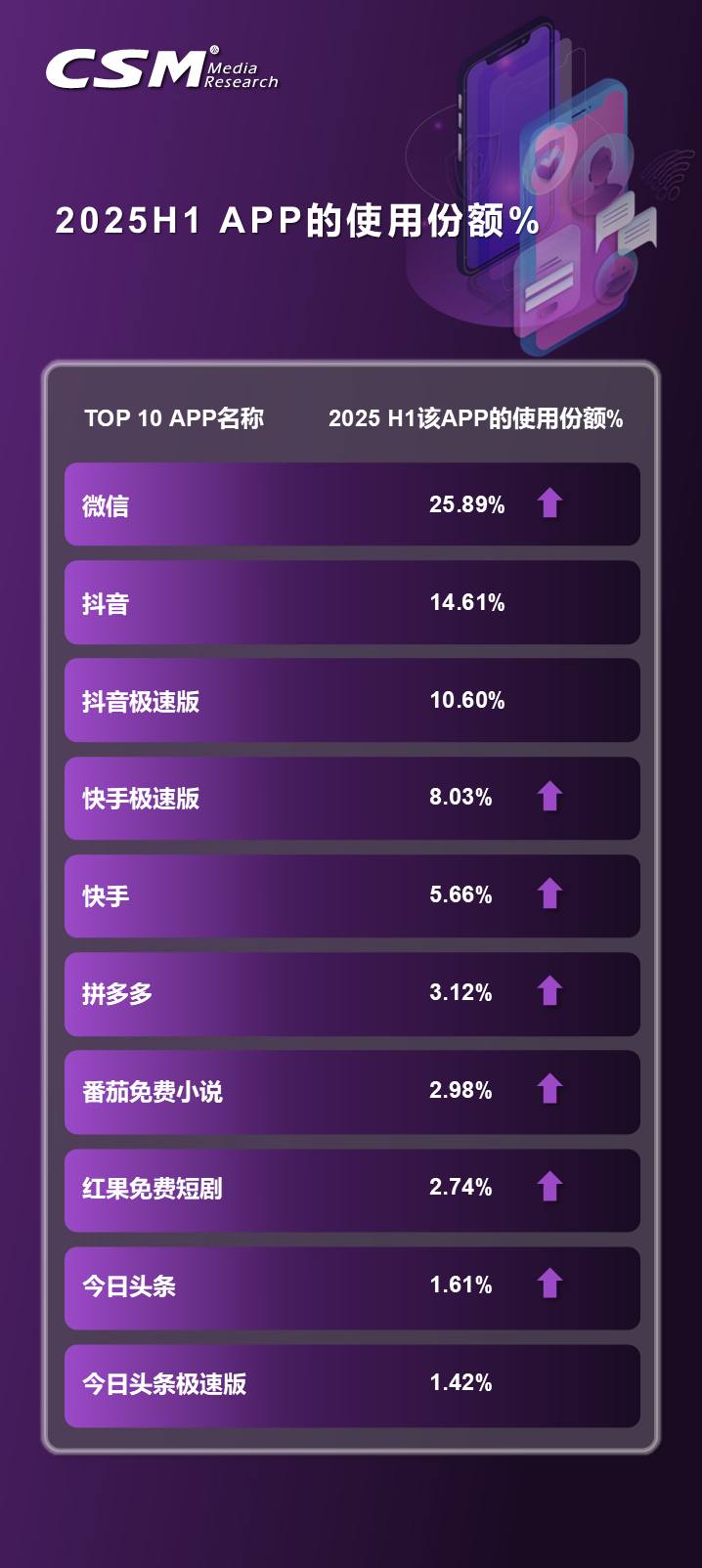 若列一份 “APP 黏人度排行榜”,前10名绝对是手机里的熟面孔。微信25.89%的份额稳站第一,抖音和快手及其极速版紧随其后,加起来占比近四成;番茄免费小说涵盖多元内容,满足不同阅读需求,占比近3%。红果免费短剧表现最亮眼,2.74%的份额较去年增长近2个百分点,增幅位居第一,闲时刷上两集,精准契合了 “短平快” 的使用场景。