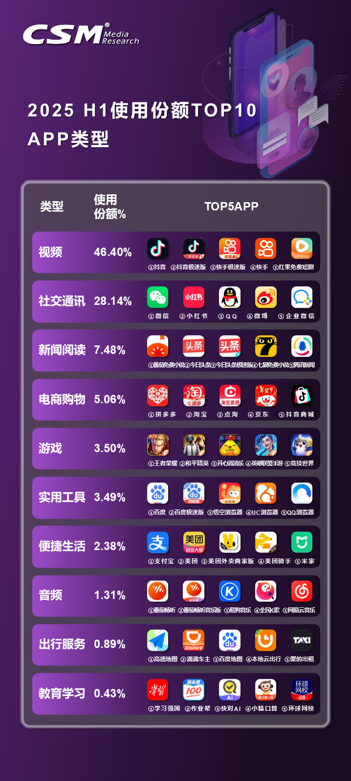 占比28.14%的社交通讯类透着股“日常感”,微信、小红书这类APP就像手机里的“常驻消息栏”,睁眼第一件事想点开,睡前最后一件事也想划划,成了生活里自带的“背景音”;王者荣耀、和平精英等游戏类内容,占比略有下降,当娱乐的选择多了,自然分走了些注意力; 而便捷生活类从1.88%升至2.38%,美团外卖、支付宝生活缴费这些“日常帮手”,则在更多生活场景里悄然扎根,成了越来越离不得的存在。