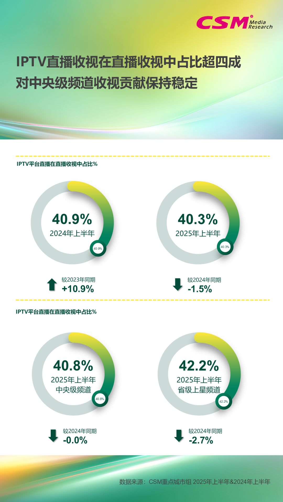 在2025年上半年,在CSM重点城市组共计1.3亿观众通过IPTV机顶盒收看直播频道;IPTV平台直播收视人均收视时长为191分钟,超过3小时;IPTV直播收视的市场份额达30%。