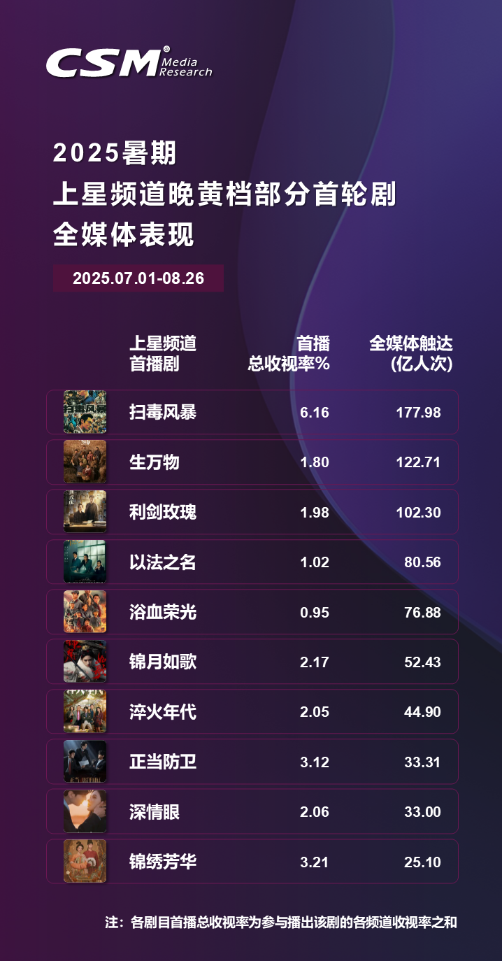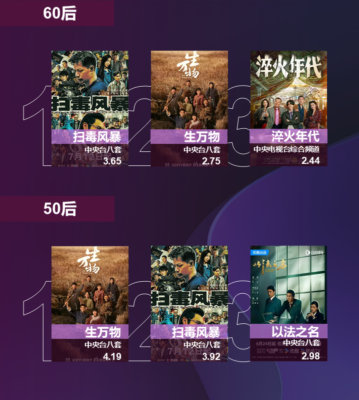 禁毒剧《扫毒风暴》便是典型代表。它采用“央视首播+卫视跟播”模式,迅速完成代际渗透,不仅以6.16%的总收视率摘得暑期“收视剧王”桂冠,而且还包揽“10后”至“60后”的收视榜首,全媒体触达人次更飙升至178亿,展现出强大的市场引领力和竞争力。该剧的“老少通吃”,源于双重情感抓手:对年轻人而言,缉毒题材的紧张刺激带来十足观剧爽感;对父辈来说,剧中烟火氤氲的年代细节唤醒了专属记忆。正是这种双向的情感契合,让“全家围坐、共话剧情”的大客厅温馨画面,成为暑期荧屏外的动人风景。