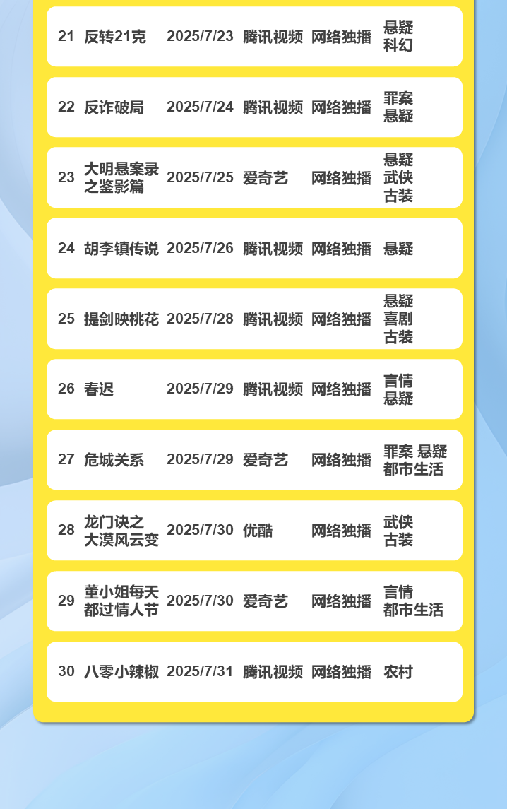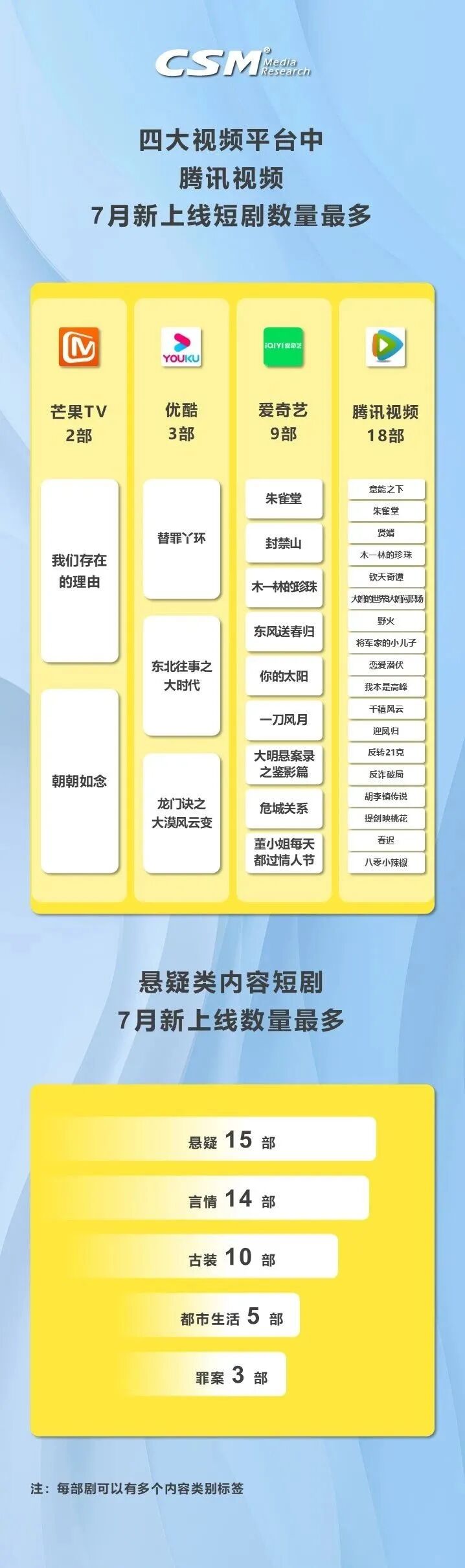 七月四大平台上新30部短剧(共计626集),上线内容时长共计144小时,平均单集13.8分钟。从分平台来看,腾讯视频以18部领跑,涵盖《朱雀堂》《反诈破局》等;爱奇艺9部、优酷3部、芒果TV2部紧随其后。题材分布中,悬疑类15部(占比50%)居首,言情类14部次之。