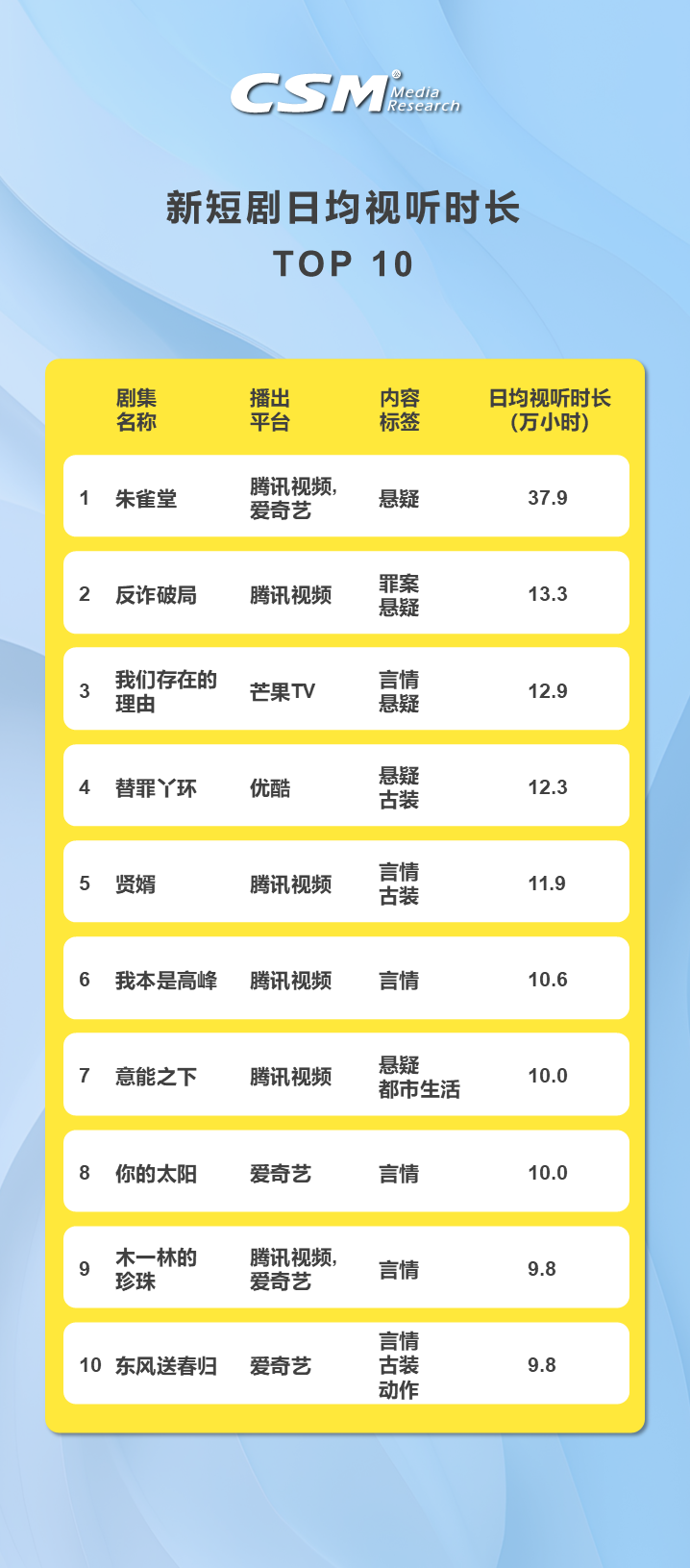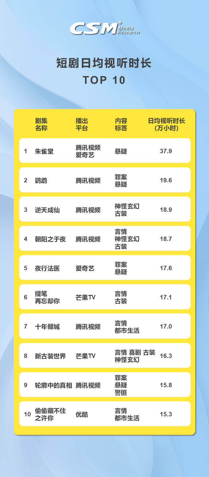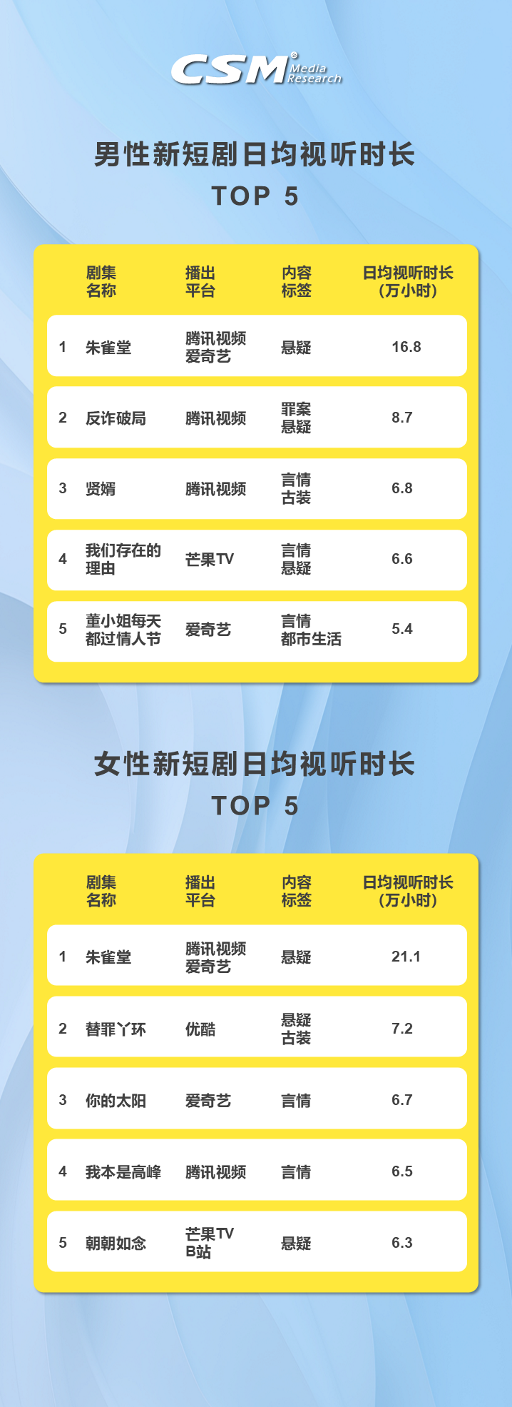 7月新上线的30部短剧里,《朱雀堂》的“统治力”真的太明显了!在新剧“日均视听时长TOP10”里,它以37.9万小时的成绩断层领先,比第二名《反诈破局》(13.3万小时)多出近两倍,完全是“一骑绝尘”的架势。而且不管是男性还是女性观众,都把它放进了偏好榜榜首之位,能看出来大家对悬疑题材的喜欢是真统一。