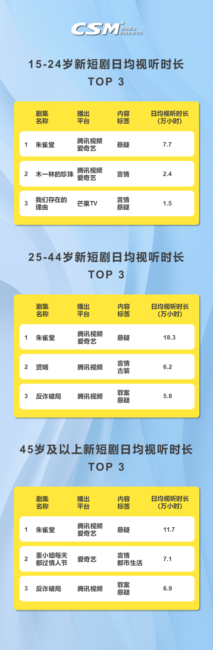 不过细分下来,男女观众的小偏好还是有点不一样:女性更爱带点细腻情感线的悬疑剧,除了《朱雀堂》(21.1万小时)外,像《替罪丫环》这种悬疑加古装的也很对胃口;男性则更倾向纯粹的罪案推理,除了追《朱雀堂》(16.8万小时),《反诈破局》这种讲破案的看得更投入。年龄层这边就更为清晰,15岁及以上的观众里,不管是青少年还是中老年,他们各自的日均视听时长TOP榜,榜首都稳稳坐着《朱雀堂》。哪怕大家平时追剧口味不尽相同,但提到这部被不少人称作“短剧革命”破局者的作品,几乎没人不夸好。这种能通吃全性别、全年龄段的好剧,在当下短剧市场里确实少见。