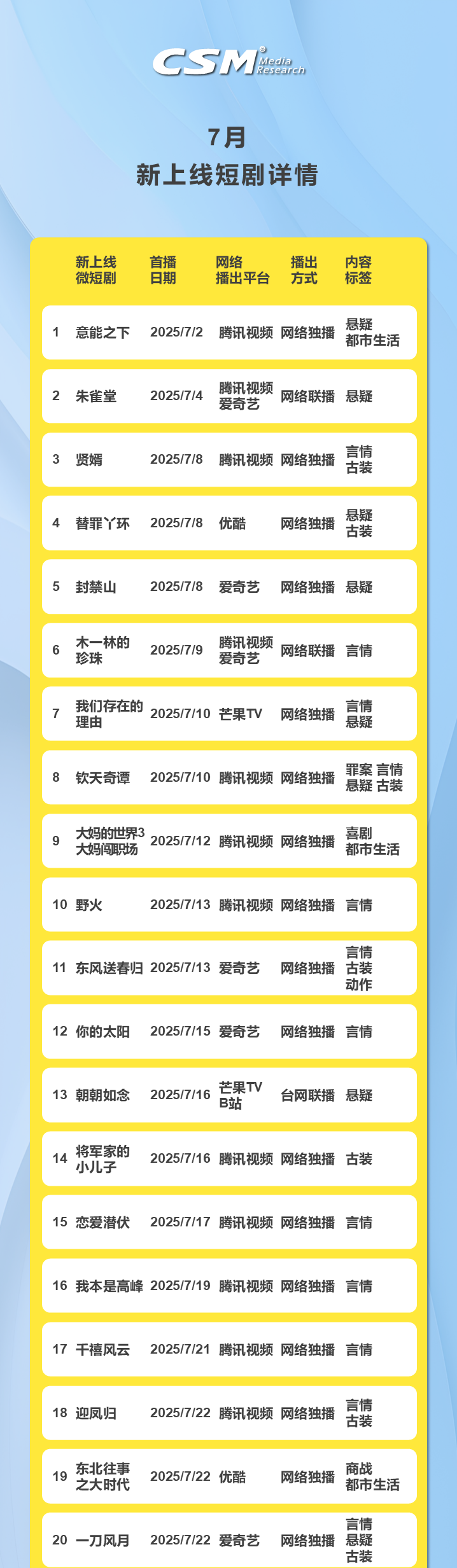 从7月短剧市场的表现来看,行业趋势已逐渐清晰。现在想靠单一题材破圈越来越难,反而“悬疑+言情”“悬疑+科幻”这种题材融合的路子,更能抓住观众注意力;各大平台也不再拼上新数量,腾讯视频靠多题材布局稳稳占住份额,爱奇艺、优酷和芒果TV则盯着垂直领域做精品,各有各的打法。更重要的是,观众分层趋势日趋显著,不同年龄段、不同性别的观众在内容偏好上差异明确。这意味着,未来短剧内容创作需紧扣受众需求差异,推进精进化、定制化的内容开发,才能更好地契合市场需求。