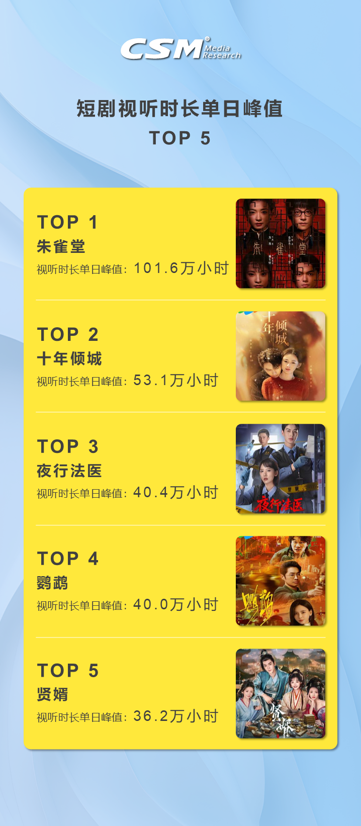 7月短剧市场受众行为特征明显,整体观看粘性显著提升。全月女性视听时长8017万小时(占比超52%),男性视听时长7221万小时,不同性别观众的参与度均保持在较高水平。头部剧集方面,在腾讯视频和爱奇艺播出的《朱雀堂》以37.9万小时的日均视听时长登顶“日均视听时长TOP榜”,是第二名《鹦鹉》(19.6万小时)的近2倍;在单日视听时长峰值榜单上《朱雀堂》也以101.6万小时的时长高居榜首,“悬疑+玄幻”题材成流量密码。