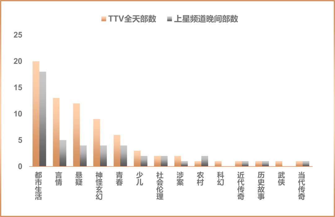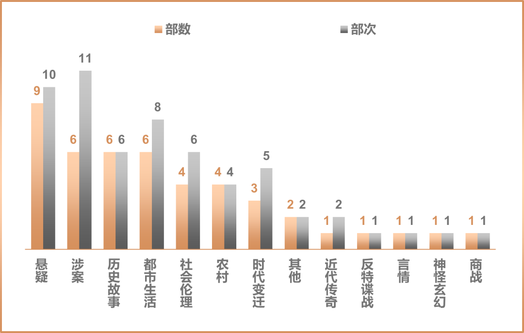 细分类型,悬疑、涉案剧成为大类题材,分别播出9和6部、10和11部次,合计占播出总量的36%(部次);都市生活剧播出8部次,社会伦理剧播出6部次,往年热播的言情剧仅播出1部次。以故事性见长的历史故事类播出6部次,跻身二类题材阵营。时代变迁剧以跌宕起伏的情节优势受到观众青睐,播出5部次。去年有一定热度的反特谍战剧相对沉寂,仅播出1部次。此外,农村剧4部次,神怪玄幻、商战和其他类各播出1-2部次。
