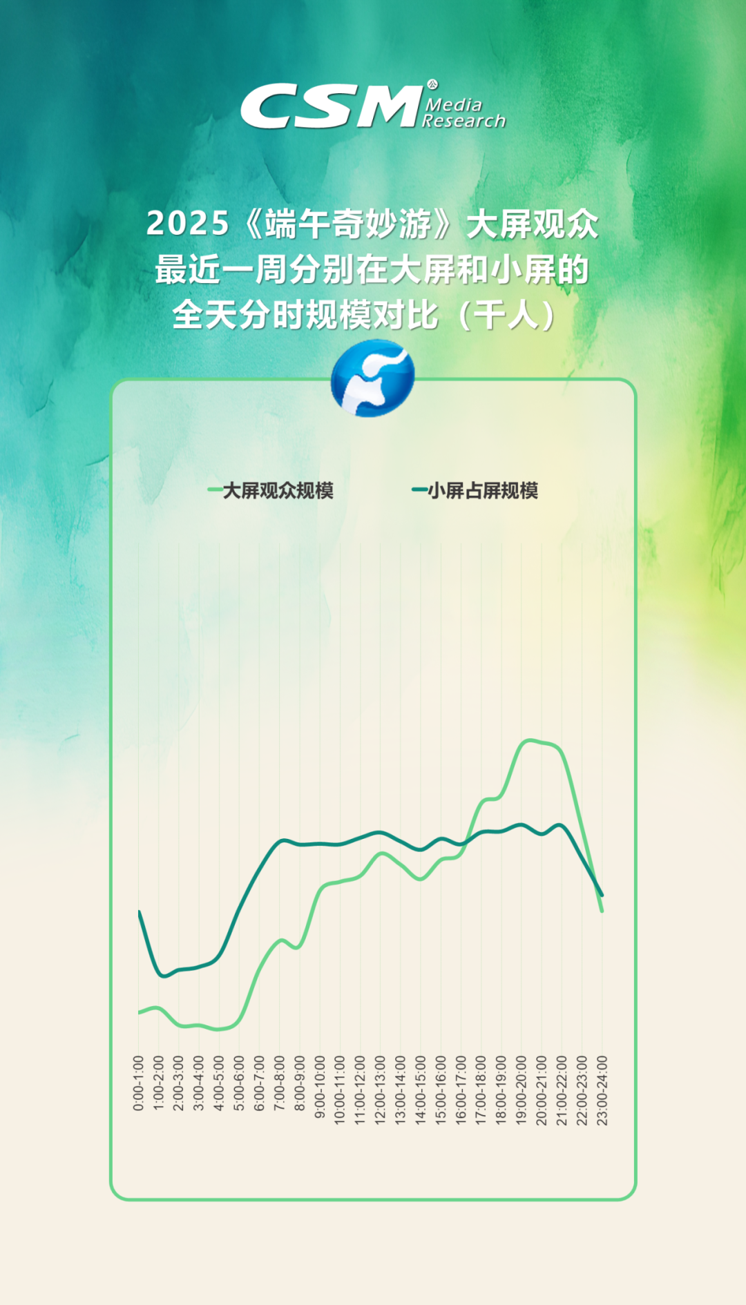 《端午奇妙游》小屏观众数据凸显移动端主导的收视特征。其规模全天维持高位,10:00-13:00出现两次相对高点,与午间休息时段高度吻合。相比电视大屏端,在19:00-21:00达到峰值。该节目的小屏观众已形成移动端主导的全天候收视习惯,大屏观看则作为晚间家庭团聚场景的重要支撑,这种收视格局反映了移动互联网时代内容消费的典型特征。