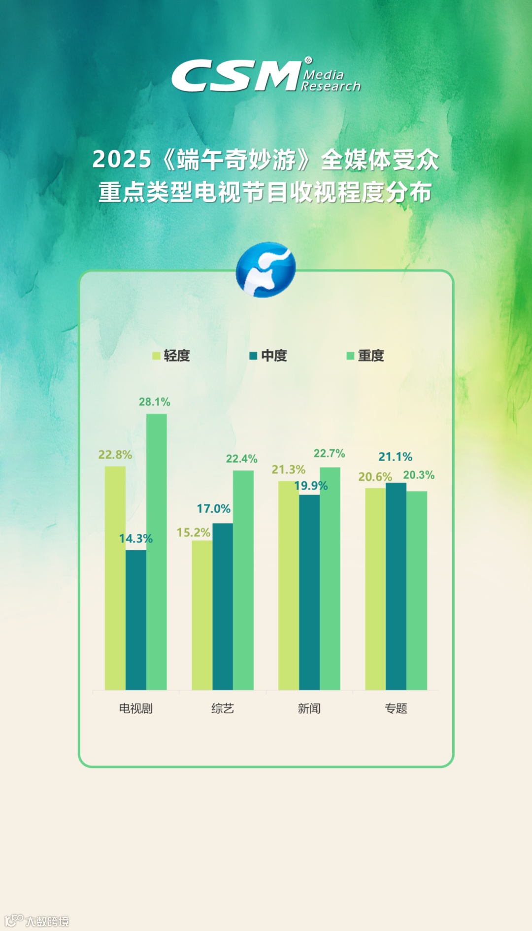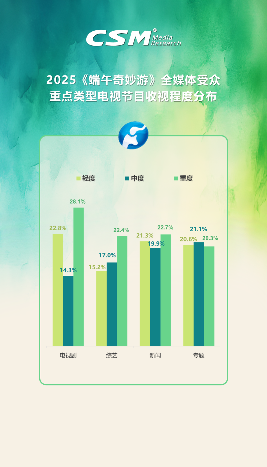 《端午奇妙游》全媒体受众对重点电视节目类型的收视程度分布显示:电视剧收视程度呈U形分布(重度28.1% > 轻度22.8% > 中度14.3%);综艺节目呈现轻度向重度递增趋势(重度22.4% > 中度17.0% > 轻度15.2%)。新闻类节目三类人群占比差值均在3个百分点内,分布最为均衡;专题节目中度人群占比(21.1%)较两端略高,形成平缓凸起。这体现了节目类型特性差异——电视剧靠内容黏性吸引深度受众,综艺以娱乐性梯度吸引,新闻凭普适性均衡覆盖,专题节目则以适度深度赢得中度观众。