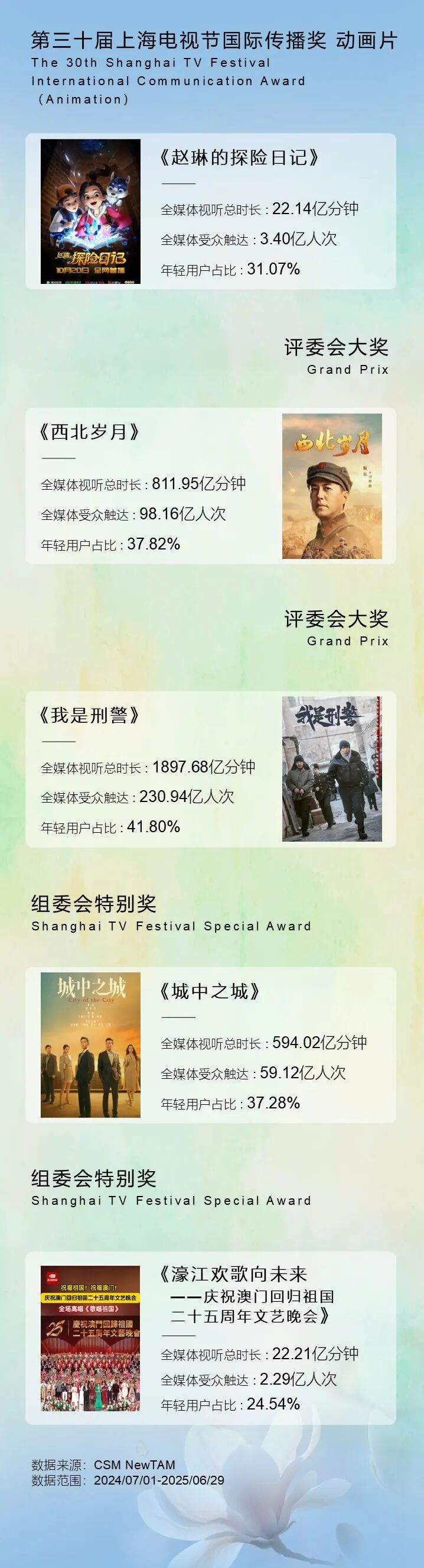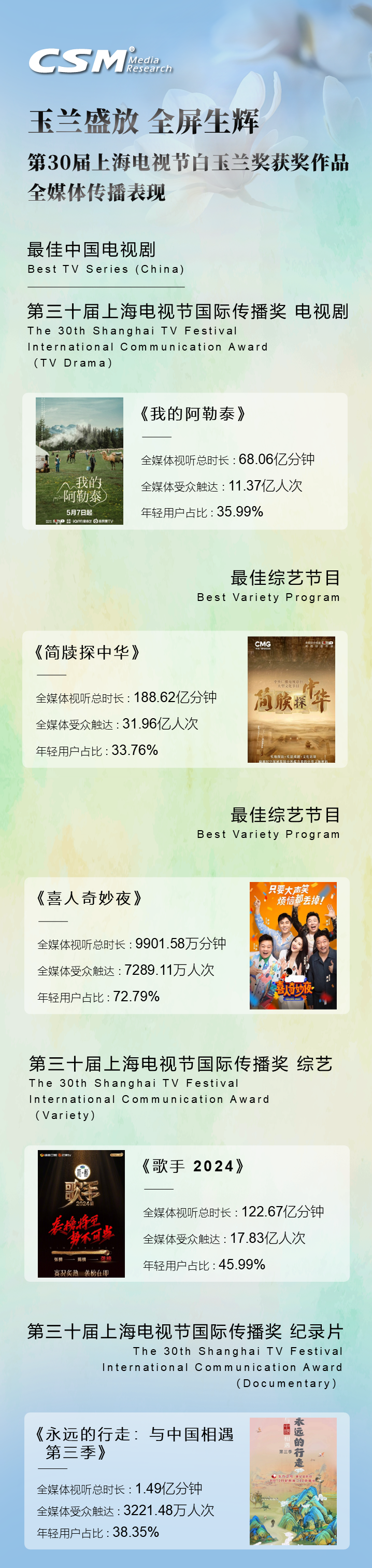除剧集外,本届白玉兰奖还涵盖综艺、纪录片、动画片等多元类型作品评选,《简牍探中华》《歌手2024》《永远的行走:与中国相遇 第三季》等不同题材佳作各放异彩,全面展现电视艺术的丰富生态。本文依托CSM全媒体数据(NewTAM),对入围作品进行多维度分析,用数据印证电视艺术持续进化的关键路径,推动优质内容在全媒体时代的价值释放。