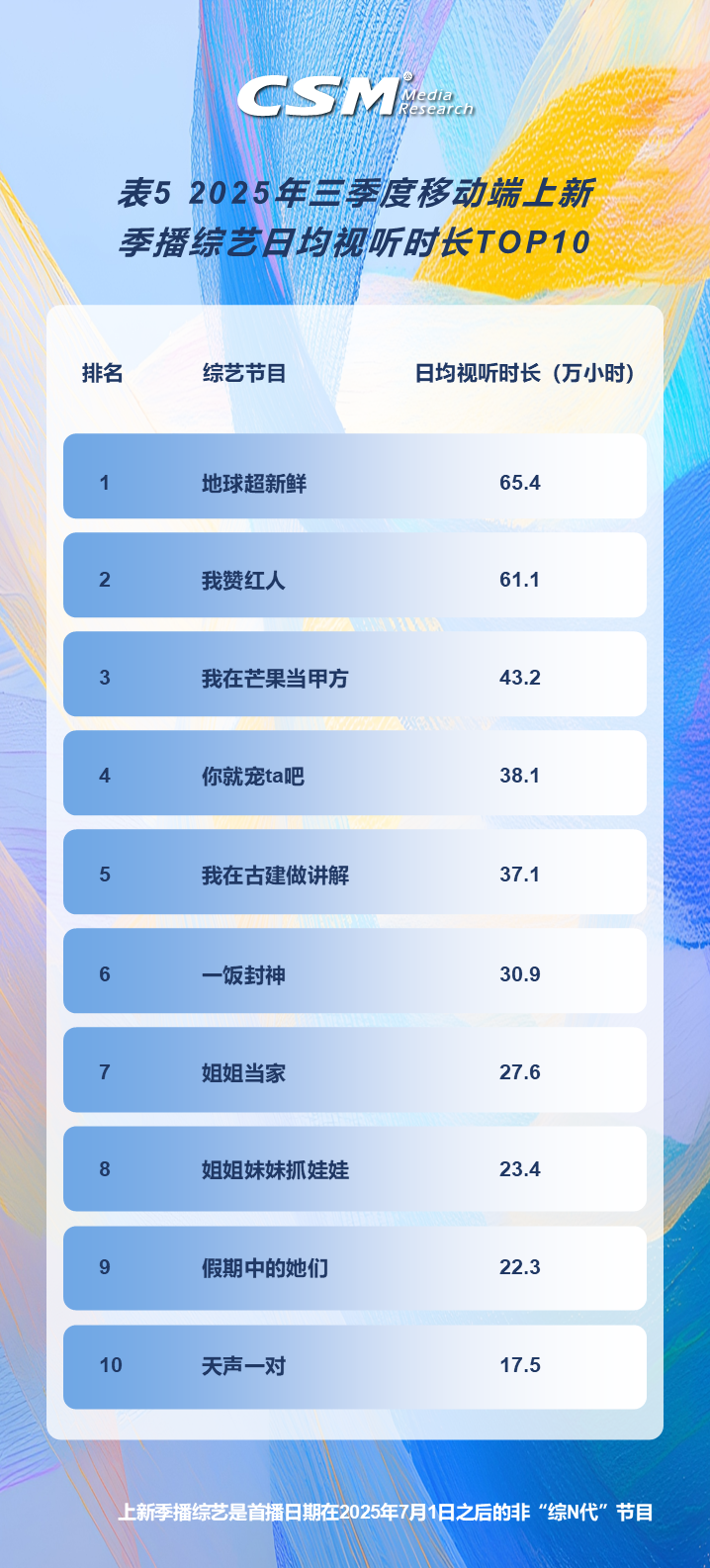 在2025年三季度移动端季播综艺中,“综N代”季播综艺TOP10日均视听时长总计715.4万小时,其中前三名均为台网联播综艺,其余在移动端仅有单一播出平台。上新季播综艺TOP10日均视听时长总计366.7万小时,几乎只在单一网络平台播出。