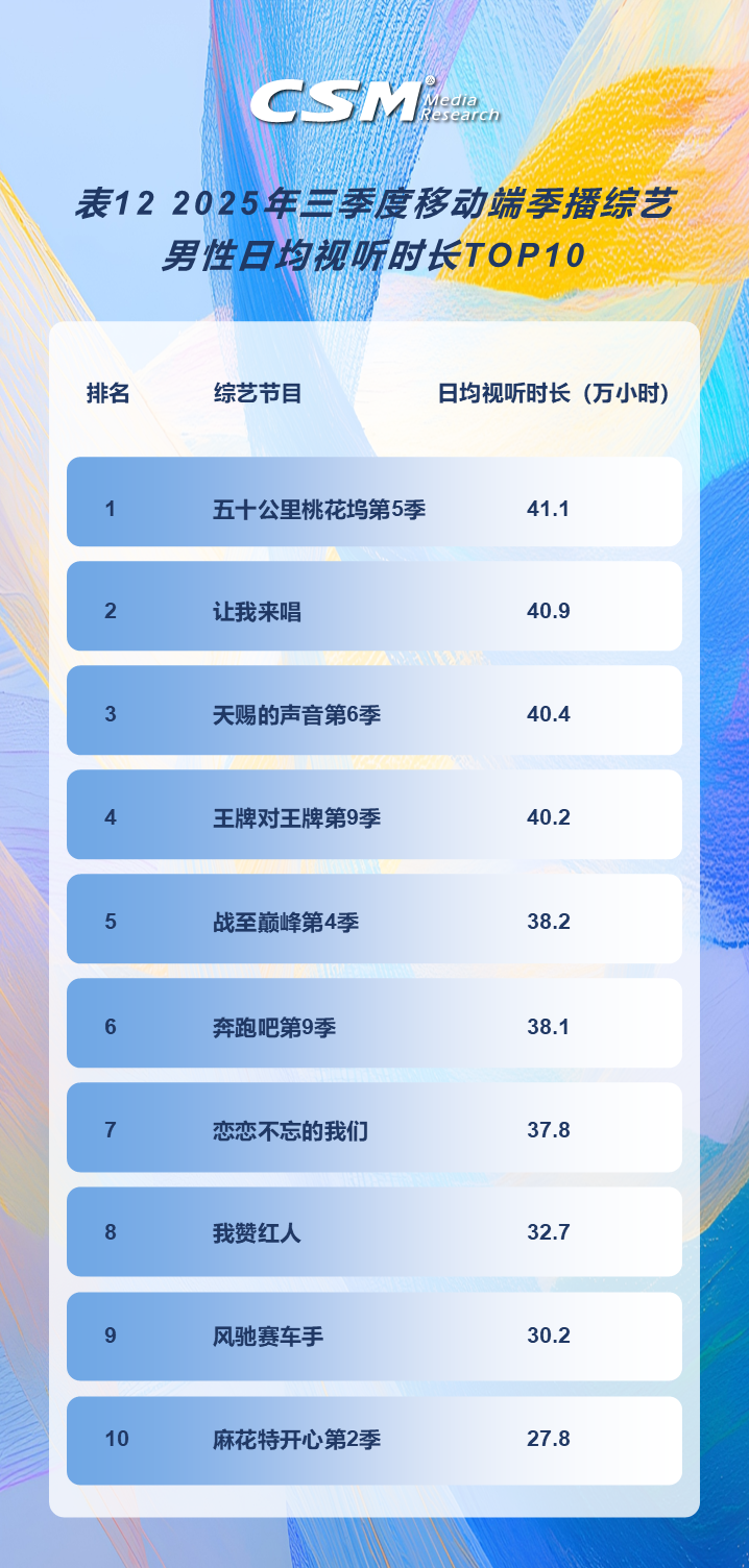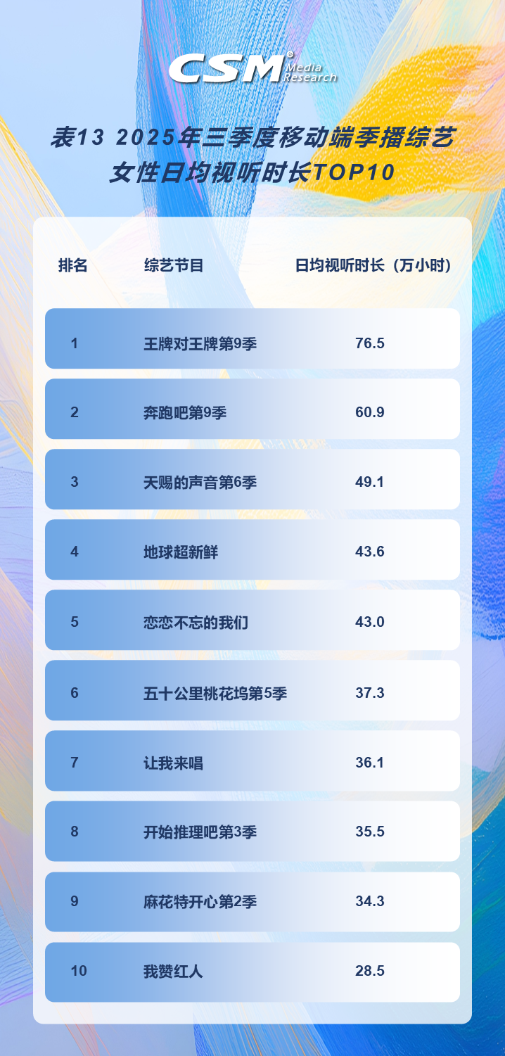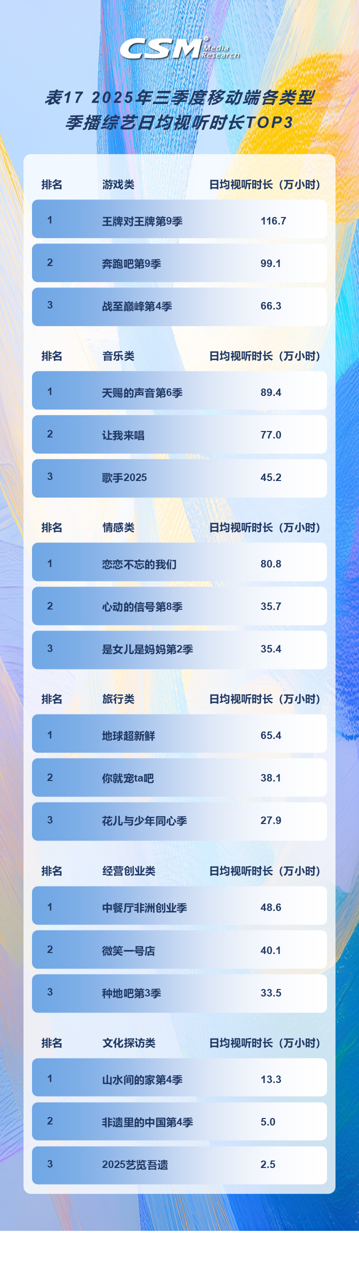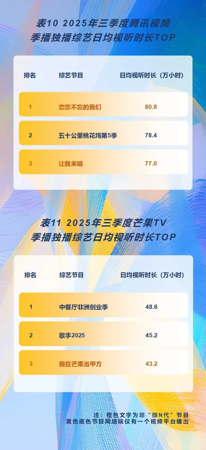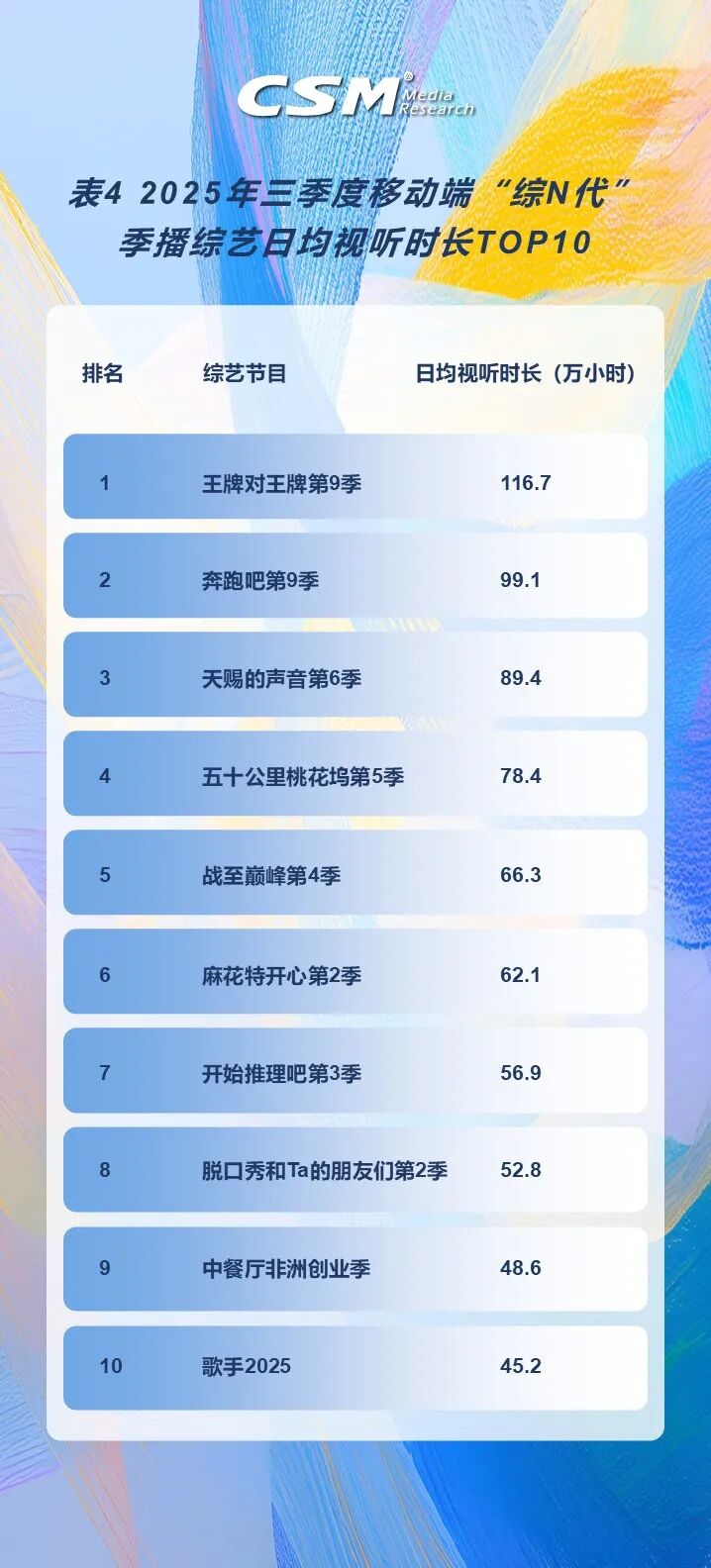 2025年三季度,头部长视频平台季播综艺日均视听时长TOP5以"综N代"为主,其中"爱优腾"联合播出《王牌对王牌第9季》《奔跑吧第9季》《天赐的声音第6季》等多个经典IP,芒果TV依旧独享自有资源。