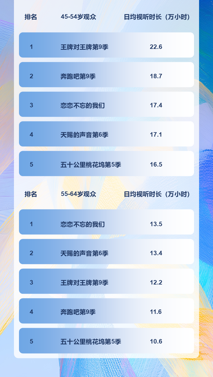 从年龄分布上看,大龄观众更喜欢情感观察类综艺,《恋恋不忘的我们》在45-64岁观众中日均视听时长排名更靠前;年轻观众更偏好游戏、社交为主题的综艺,《五十公里桃花坞第5季》《地球超新鲜》在45岁以下年轻观众群体中日均视听时长排名更靠前;《奔跑吧第9季》《王牌对王牌第9季》《天赐的声音第6季》等多年屹立不倒的国民综艺则击穿年龄圈层,在各年龄段观众中均受欢迎。