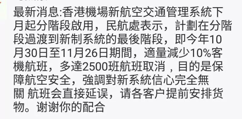 由于香港机场10月30号至11月26开始启用新空管系统,期间将会取消约2500个客机航班,预计将会影响到整个香港货运仓位,我司将会密切跟进航班信息,最大努力做好航班调整的应对措施,如有航班延误货取消将第一时间通知,感谢大家一直以来的理解以及支持,谢谢!