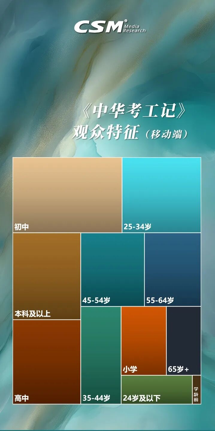 用户结构的差异,恰恰印证了《中华考工记》的跨圈层传播价值。大屏端以稳定而庞大的观众群筑牢了节目的基本盘,其深厚的文化底蕴与沉稳的叙事风格在传统电视渠道获得了强烈共鸣;移动端鲜明呈现“年轻化、高知化”特质,25-34岁群体构成主力,本科及以上学历观众占比尤为突出。这种受众画像的形成,离不开小屏碎片化、轻量化的传播巧思 —— 它像一座灵活的桥梁,将古老技艺悄然送入年轻群体与高知圈层的视野,彻底打破了“文化节目只吸引中老年人”的刻板印象。