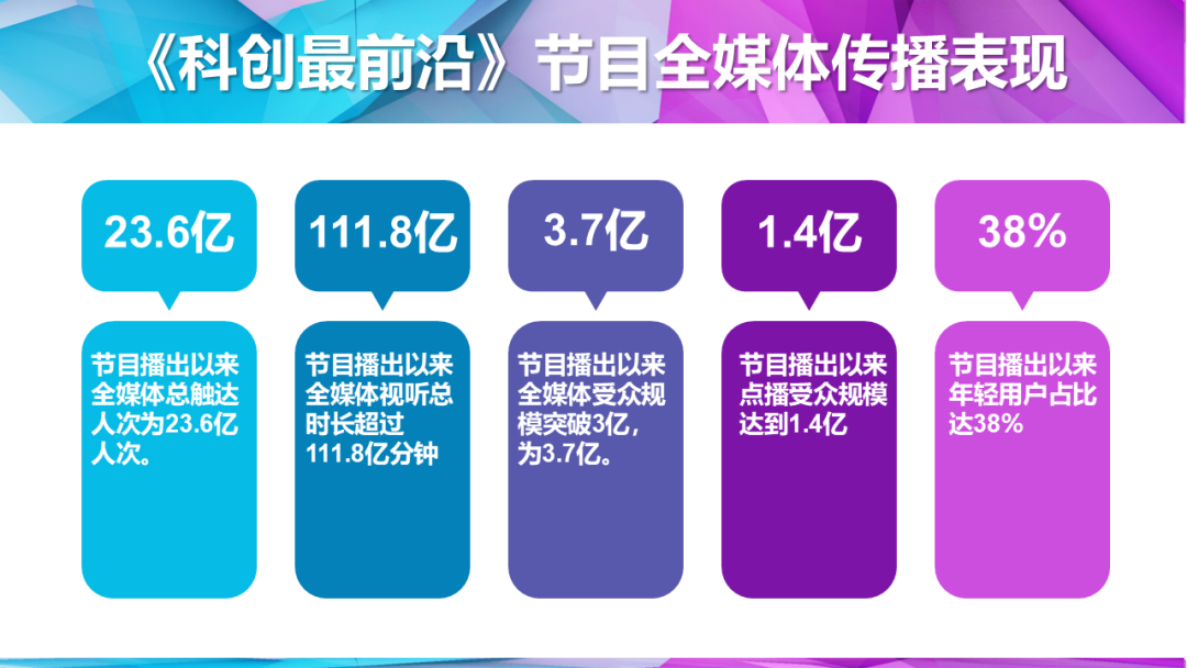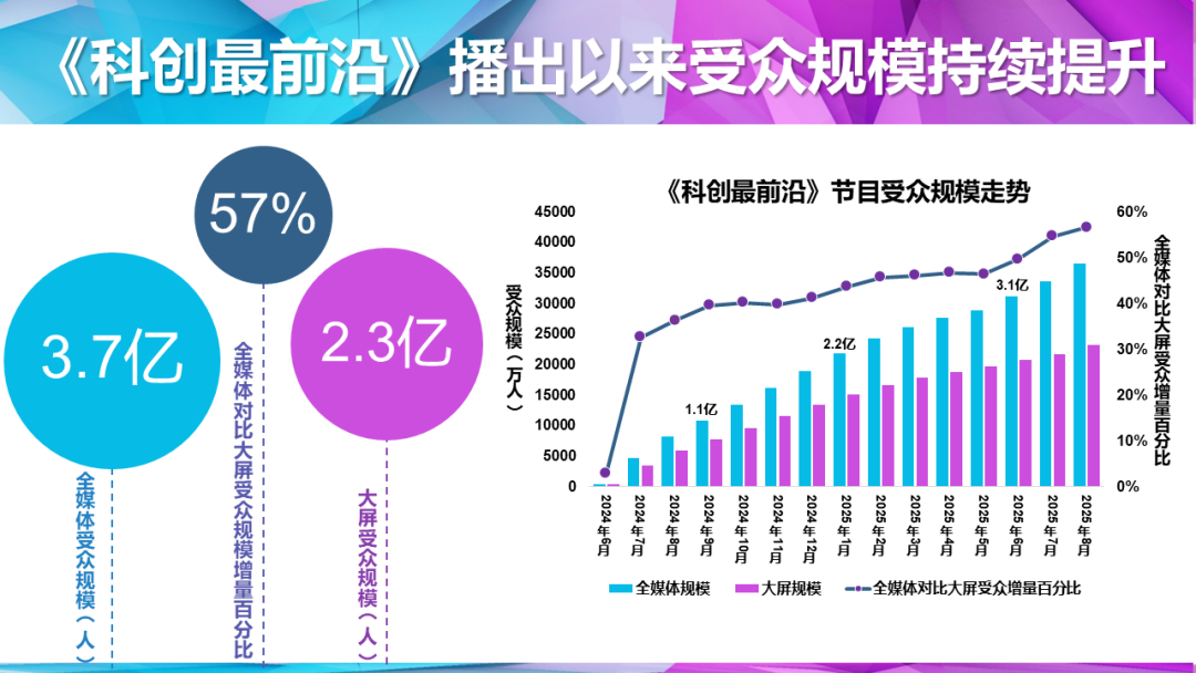 受众通过不同的渠道和方式收看《科创最前沿》。根据CSM全媒体数据(NewTAM)显示,节目播出14个月以来,全媒体视听总时长超过111.8亿分钟,总触达超过23.6亿人次,年轻观众占比达38%,收获近3.7亿的全媒体受众,其中直播受众规模超过2.7亿,点播观众规模达到1.4亿。
