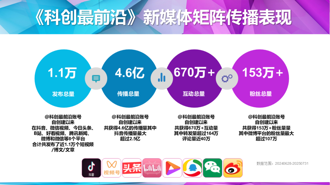 《科创最前沿》积极在新媒体端组合布局,不断完善节目的新媒体传播品牌,打造出@科创最前沿融合传播矩阵。节目在抖音、微信视频、今日头条、B站、好看视频、腾讯视频、腾讯新闻、微信公众号和微博等平台发布相关新媒体内容近1.1万条,收获超过4.6亿的传播量和超过670万的互动量,获得了超过153万粉丝的关注且粉丝数量持续增长,并多次登榜CSM V+SCOPE 融合媒体数据云平台的跨平台账号成长指数榜。