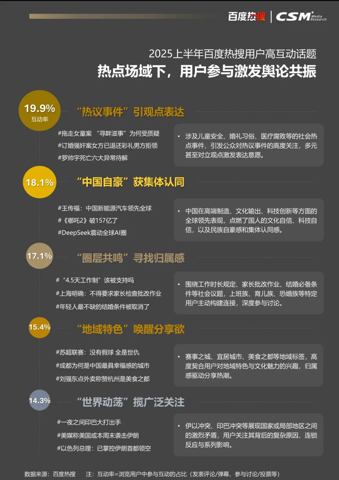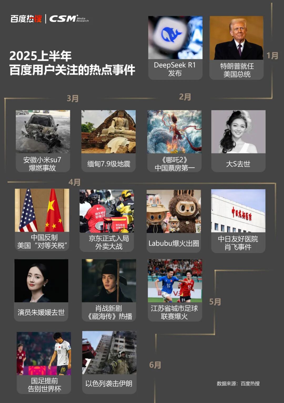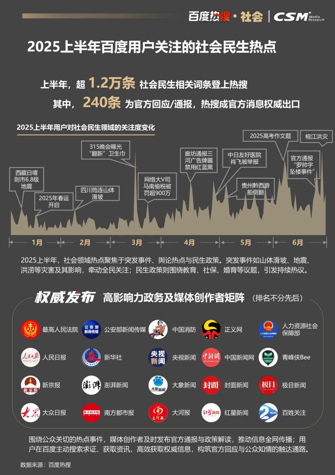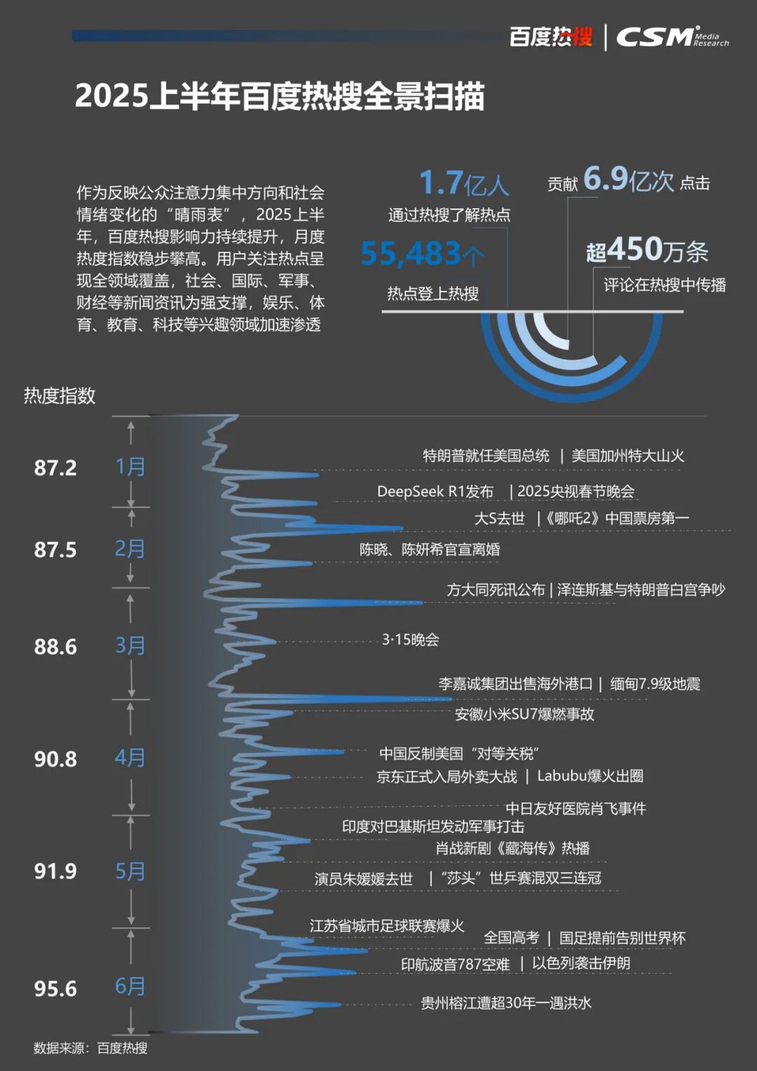 百度热搜与中国广视索福瑞媒介研究(CSM)联合发布《2025百度热搜年中报告》,基于海量热点数据与深度洞察,全景扫描上半年国民关注焦点。报告显示,2025上半年,百度热搜作为洞悉公众注意力流向与社会情绪变迁的"晴雨表",累计汇聚5.5万个热点议题,吸引逾1.7亿用户驻足追踪。