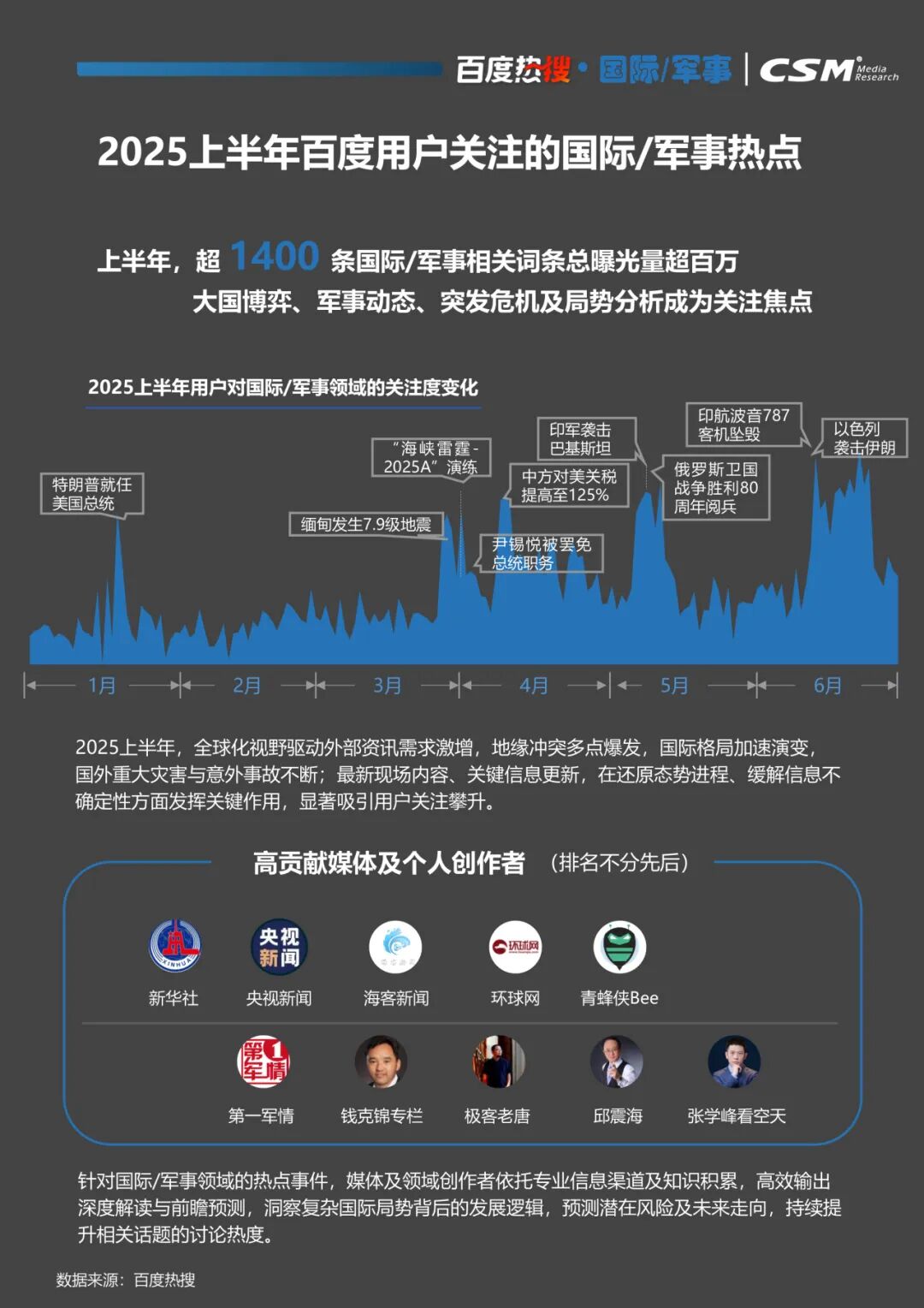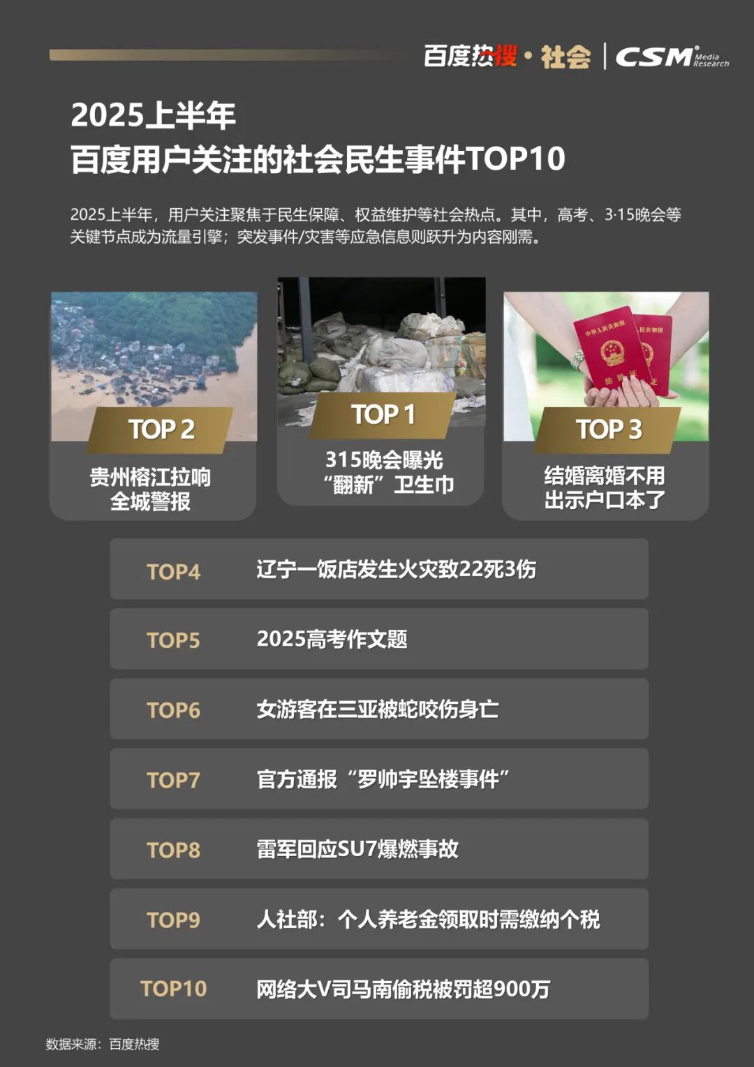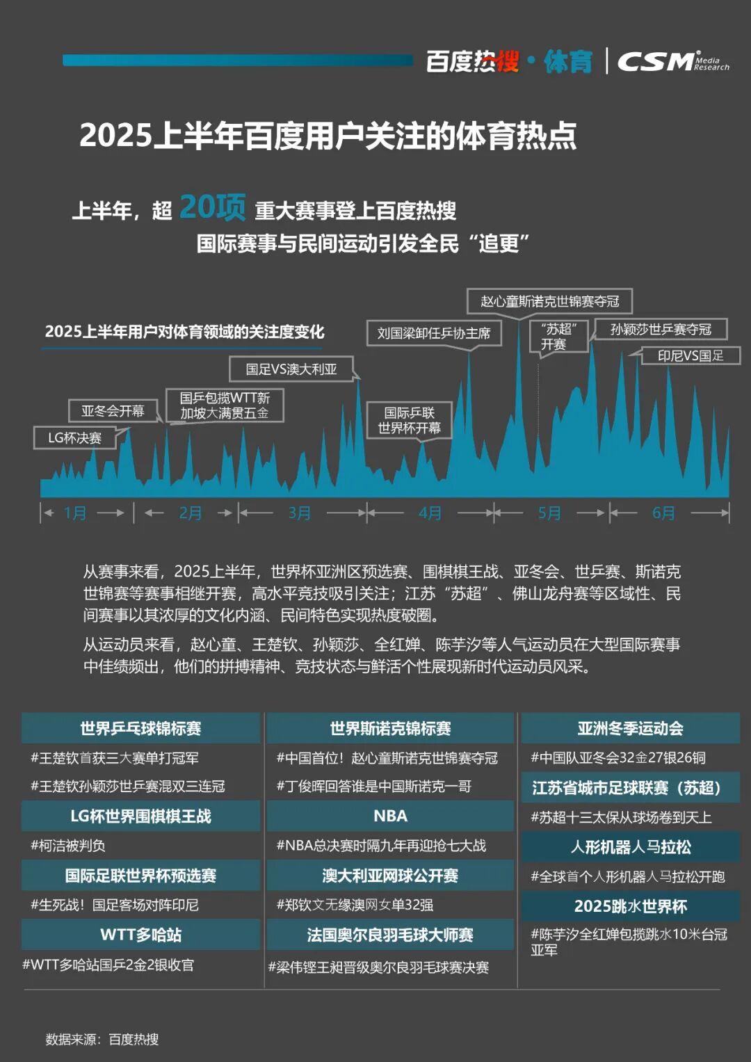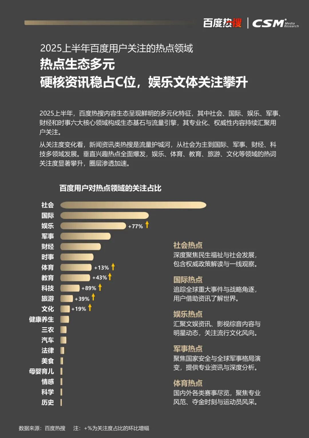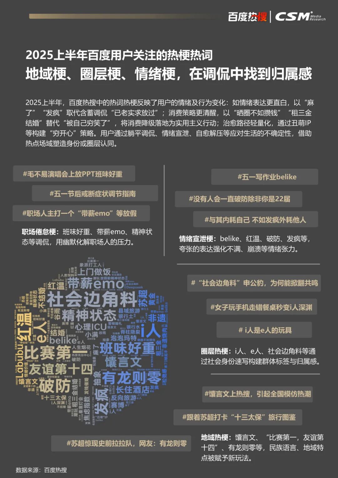 百度热搜与中国广视索福瑞媒介研究(CSM)联合发布《2025百度热搜年中报告》,基于海量热点数据与深度洞察,全景扫描上半年国民关注焦点。报告显示,2025上半年,百度热搜作为洞悉公众注意力流向与社会情绪变迁的"晴雨表",累计汇聚5.5万个热点议题,吸引逾1.7亿用户驻足追踪。