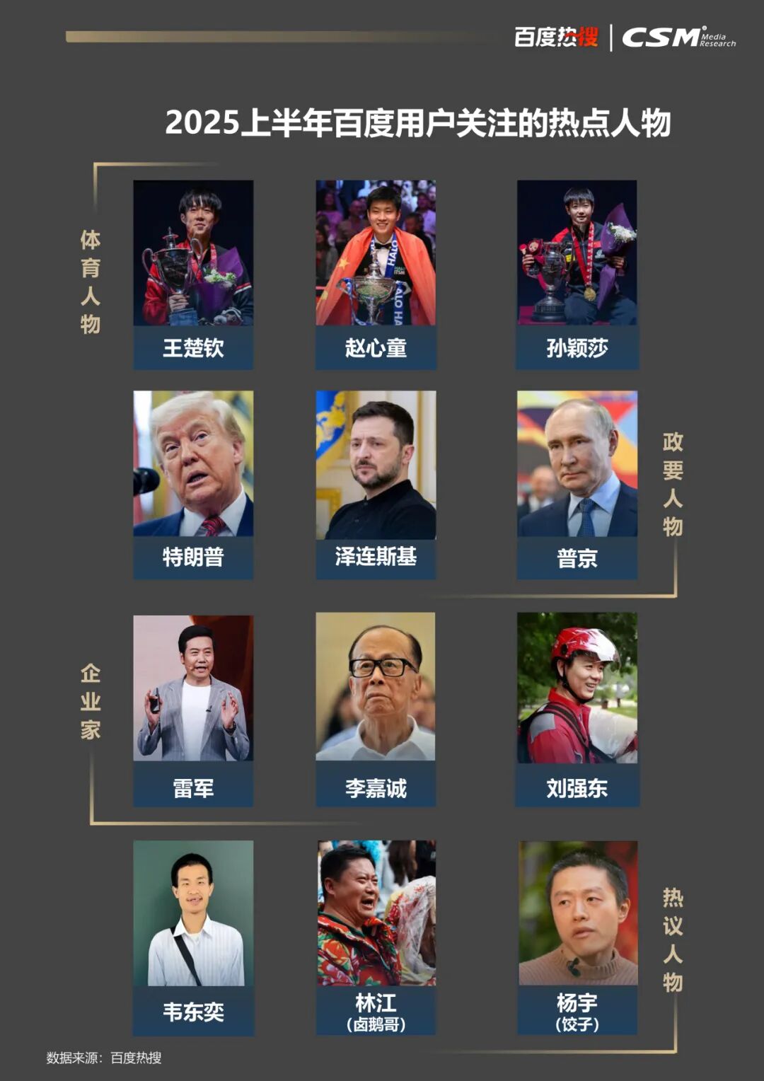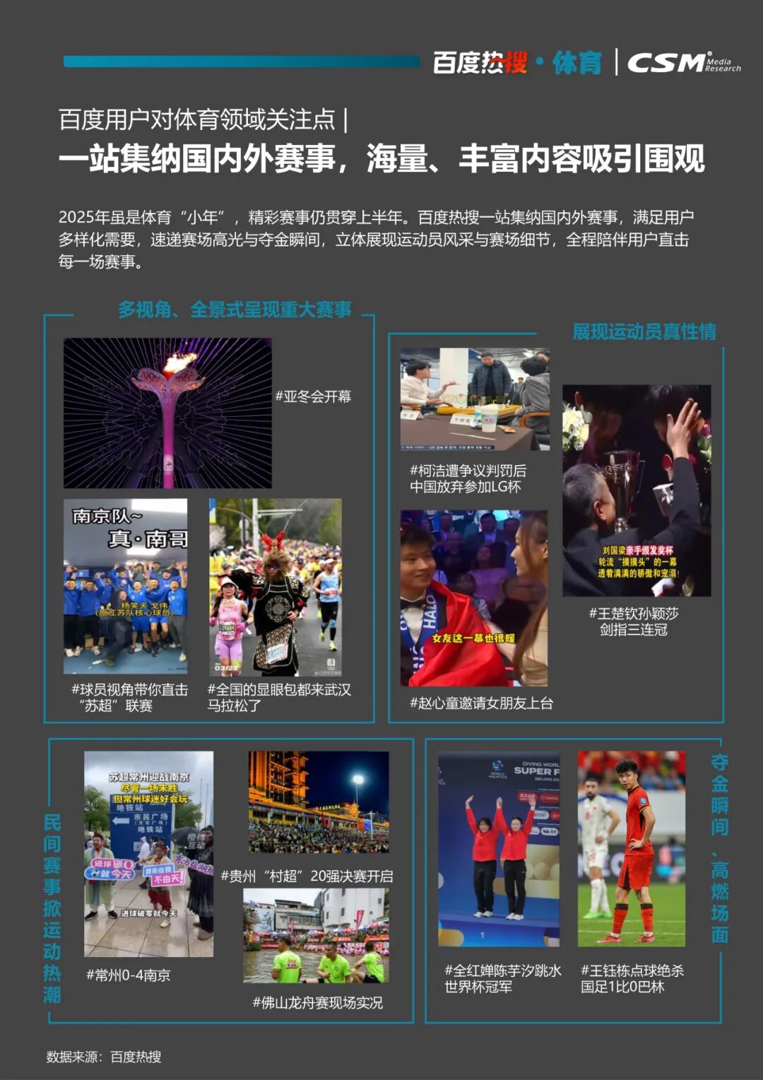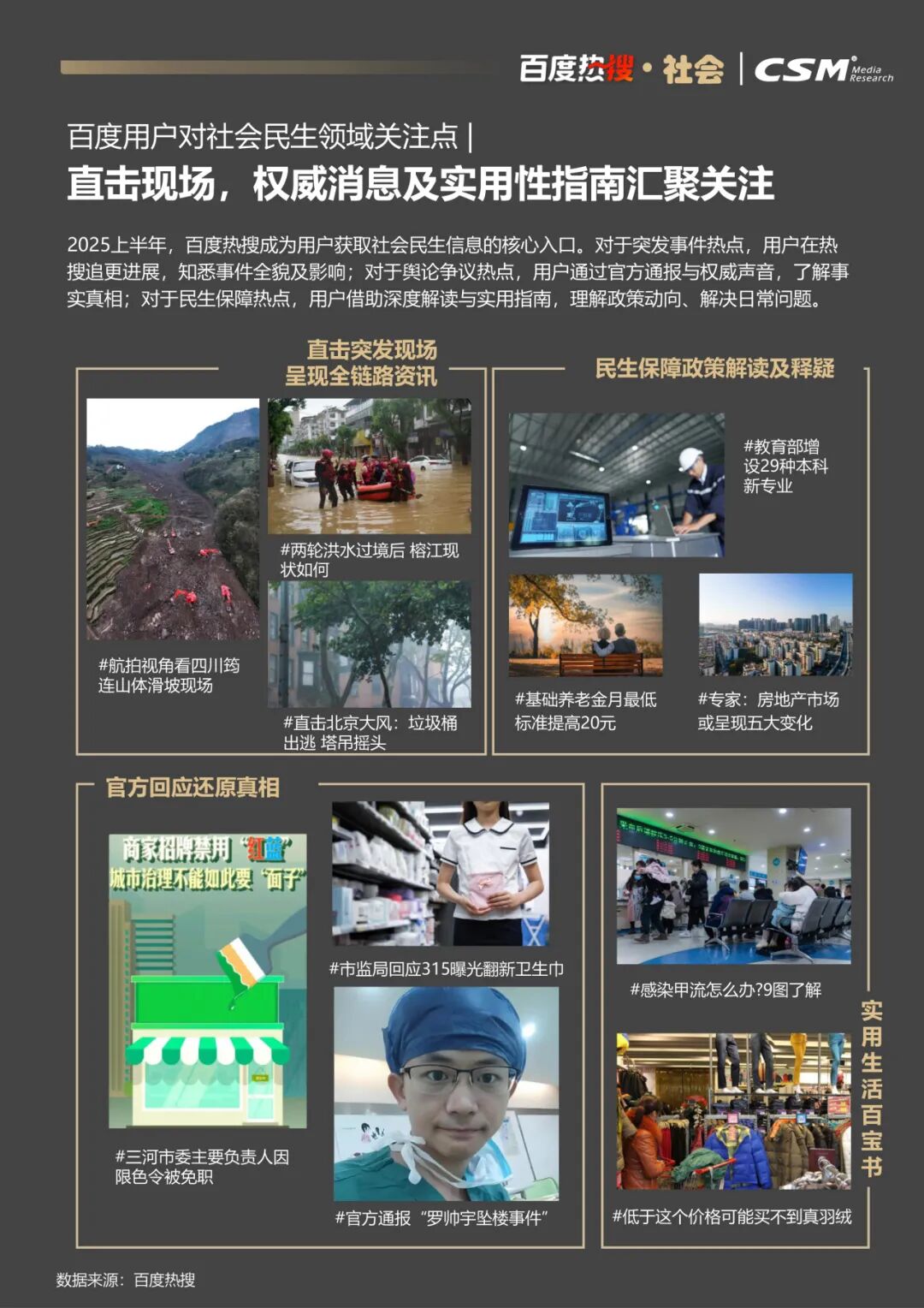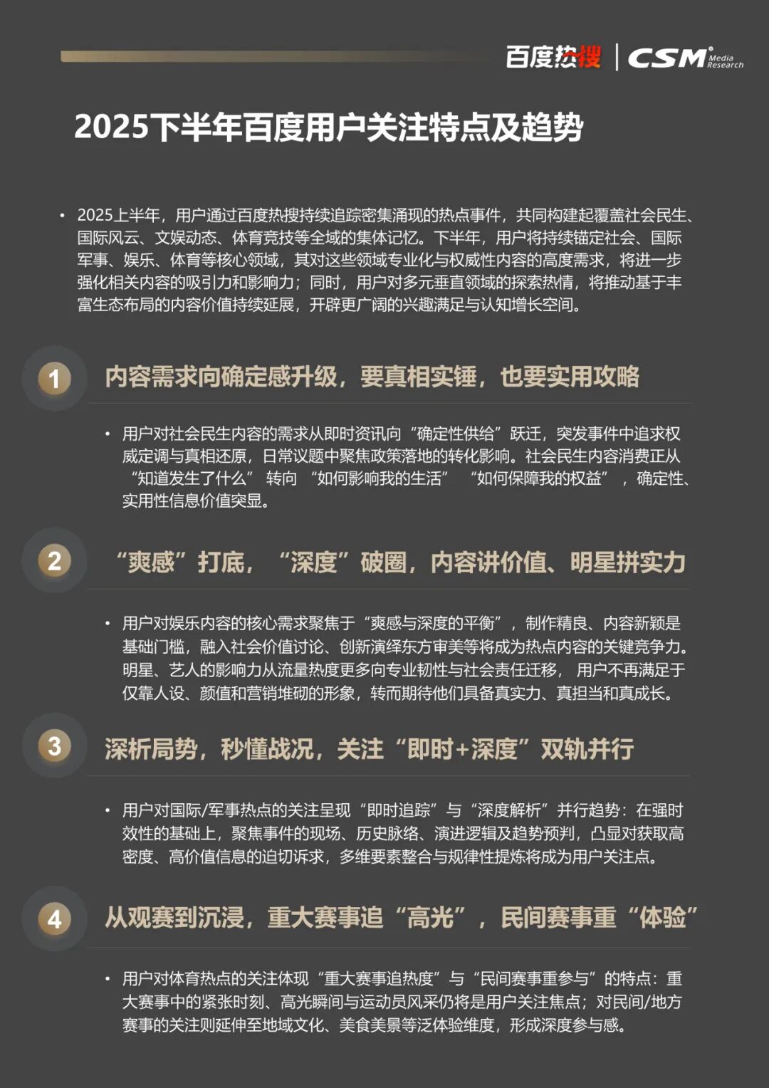 百度热搜与中国广视索福瑞媒介研究(CSM)联合发布《2025百度热搜年中报告》,基于海量热点数据与深度洞察,全景扫描上半年国民关注焦点。报告显示,2025上半年,百度热搜作为洞悉公众注意力流向与社会情绪变迁的"晴雨表",累计汇聚5.5万个热点议题,吸引逾1.7亿用户驻足追踪。