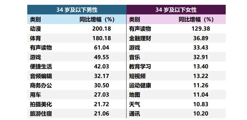 通过对2023~2024年CSM新网中34岁及以下的男性及女性用户手机APP使用行为的数据分析,不难看出各类APP赛道中的使用时长变化,同步勾画出适婚男女生活形态的变化(表1)。